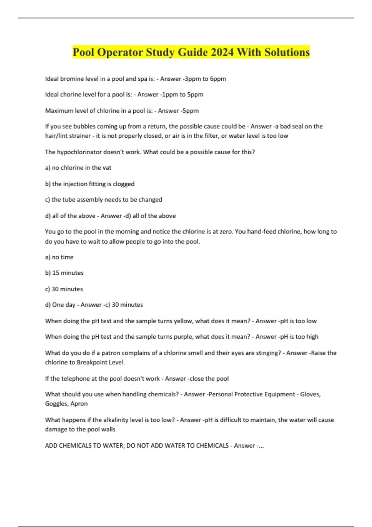 Pool Operator Study Guide 2024 With Solutions Ideal bromine level in a pool and spa is: - Answer -3ppm to 6ppm Ideal chorine level for a pool is: - Answer -1ppm to 5ppm Maximum level of chlorine in a pool is: - Answer -5ppm If you see bubbles coming up from a return, the possible cause could be - Answer -a bad seal on the hair/lint strainer - it is not properly closed, or air is in the filter, or water level is too low The hypochlorinator doesn't work. What could be a possible cause for this? a) no chlorine in the vat b) the injection fitting is clogged c) the tube assembly needs to be changed d) all of the above - Answer -d) all of the above You go to the pool in the morning and notice the chlorine is at zero. You hand-feed chlorine, how long to do you have to wait to allow people to go into the pool. a) no time b) 15 minutes c) 30 minutes d) One day - Answer -c) 30 minutes When doing the pH test and the sample turns yellow, what does it mean? - Answer -pH is too low When doing the pH test and the sample turns purple, what does it mean? - Answer -pH is too high What do you do if a patron complains of a chlorine smell and their eyes are stinging? - Answer -Raise the chlorine to Breakpoint Level. If the telephone at the pool doesn't work - Answer -close the p