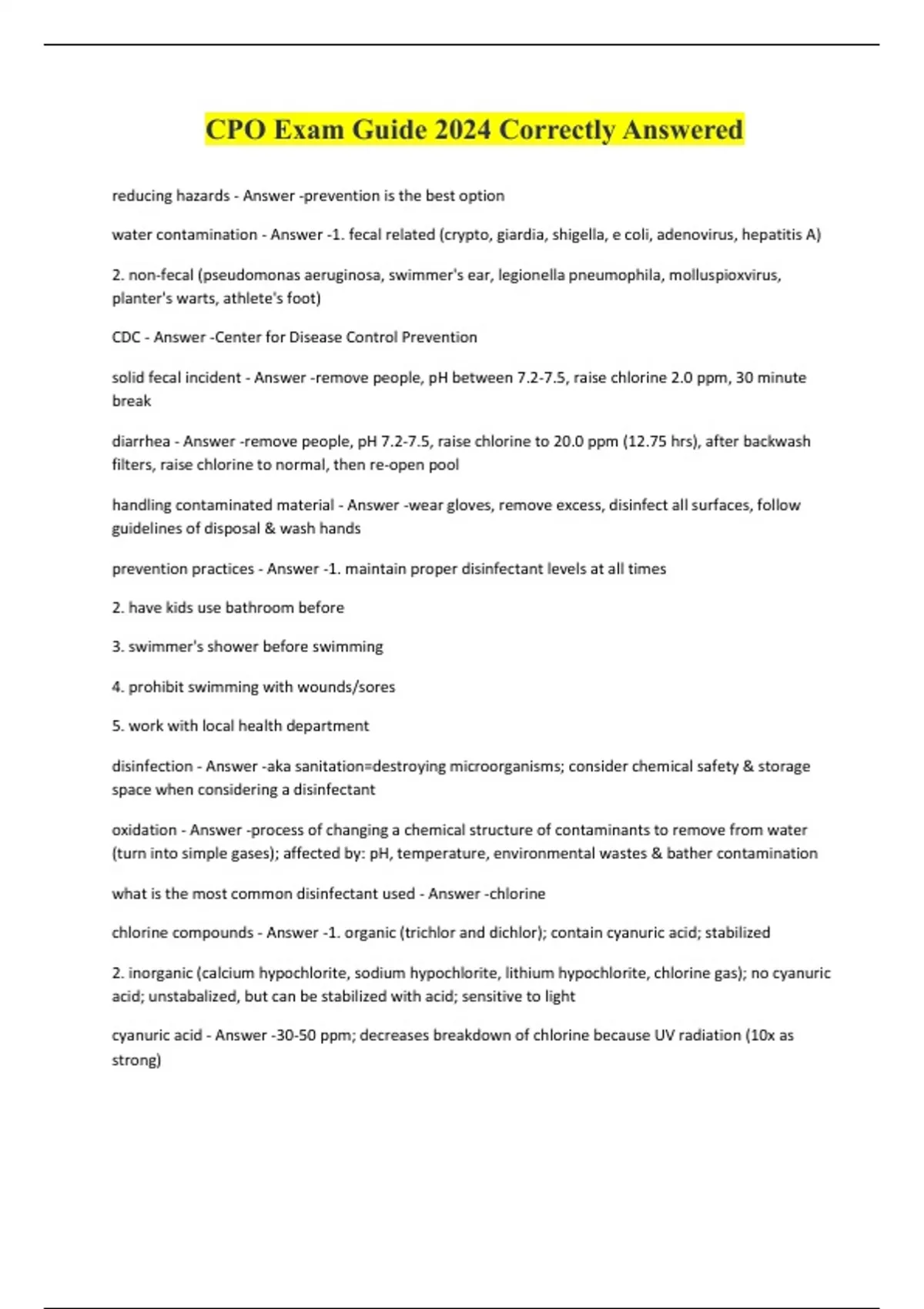 CPO Exam Guide 2024 Correctly Answered reducing hazards - Answer -prevention is the best option water contamination - Answer -1. fecal related (crypto, giardia, shigella, e coli, adenovirus, hepatitis A) 2. non-fecal (pseudomonas aeruginosa, swimmer's ear, legionella pneumophila, molluspioxvirus, planter's warts, athlete's foot) CDC - Answer -Center for Disease Control Prevention solid fecal incident - Answer -remove people, pH between 7.2-7.5, raise chlorine 2.0 ppm, 30 minute break diarrhea - Answer -remove people, pH 7.2-7.5, raise chlorine to 20.0 ppm (12.75 hrs), after backwash filters, raise chlorine to normal, then re-open pool handling contaminated material - Answer -wear gloves, remove excess, disinfect all surfaces, follow guidelines of disposal & wash hands prevention practices - Answer -1. maintain proper disinfectant levels at all times 2. have kids use bathroom before 3. swimmer's shower before swimming 4. prohibit swimming with wounds/sores 5. work with local health department disinfection - Answer -aka sanitation=destroying microorganisms; consider chemical safety & storage space when considering a disinfectant oxidation - Answer -process of changing a chemical structure of contaminants to remove from water (turn into simple gases); affected by: pH, temperature, environmental wastes & bather contamination what is the most common disinfectant used - Answer -chlorine chlorine compounds - Answer -1. organic (trichlor and dichlor); contain cyanuric acid; stabilized 2. inorganic (calcium hypochlorite, sodium hypochlorite, lithium hypochlorite, chlorine gas); no cyanuric acid; unstabalized, but can be stabilized with acid; sensitive to lig