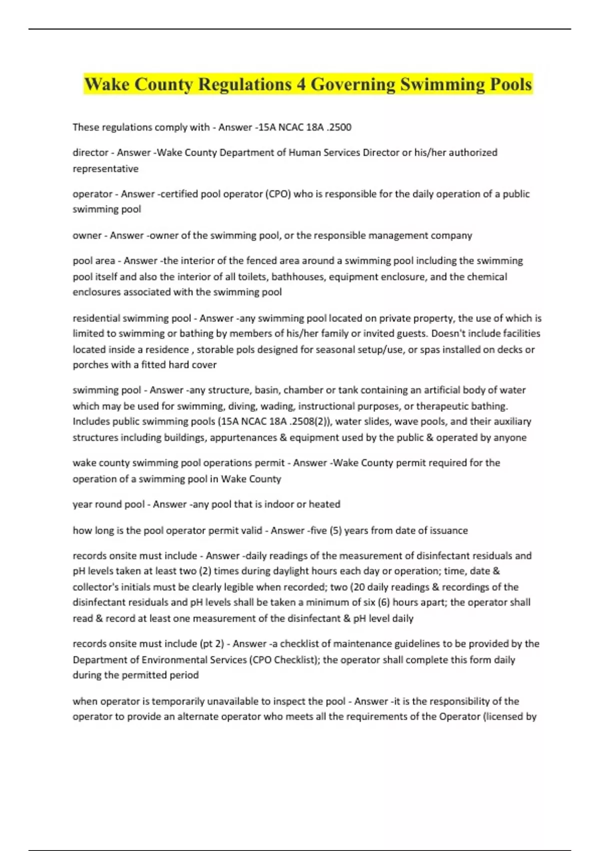 Wake County Regulations 4 Governing Swimming Pools These regulations comply with - Answer -15A NCAC 18A .2500 director - Answer -Wake County Department of Human Services Director or his/her authorized representative operator - Answer -certified pool operator (CPO) who is responsible for the daily operation of a public swimming pool owner - Answer -owner of the swimming pool, or the responsible management company pool area - Answer -the interior of the fenced area around a swimming pool including the swimming pool itself and also the interior of all toilets, bathhouses, equipment enclosure, and the chemical enclosures associated with the swimming pool residential swimming pool - Answer -any swimming pool located on private property, the use of which is limited to swimming or bathing by members of his/her family or invited guests. Doesn't include facilities located inside a residence , storable pols designed for seasonal setup/use, or spas installed on decks or porches with a fitted hard cover swimming pool - Answer -any structure, basin, chamber or tank containing an artificial body of water which may be used for swimming, diving, wading, instructional purposes, or therapeutic bathing. Includes public swimming pools (15A NCAC 18A .2508(2)), water slides, wave pools, and their auxiliary structures including buildings, appurtenances & equipment used by the public & operated by anyone wake county swimming pool operations permit - Answer -Wake County permit required for the operation of a swimming pool in Wake County year round pool - Answer -any pool that is indoor or heated how long is the pool operator permit valid - Answer -five (5) years from date of issuance records onsite must include - Answer -daily readings of the measurement of disinfectant residuals and pH levels taken at least two (2) times during daylight hours each day or operation; time, date & collector's initials must be clearly legible when recorded; two (20 daily readings & recordings of the disinfectant residuals and pH levels shall be taken a minimum of six (6) hours apart; the operator shall read & record at least one measurement of the disinfectant & pH level daily records onsite must include (pt 2) - Answer -a checklist of maintenan