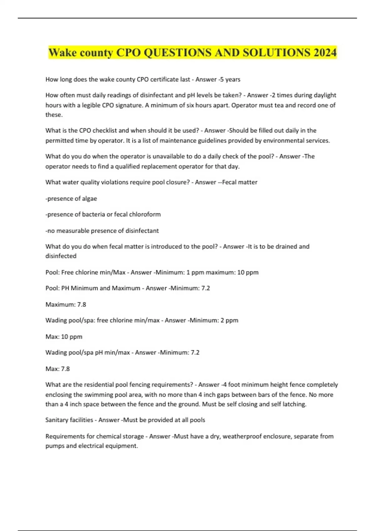 Wake county CPO QUESTIONS AND SOLUTIONS 2024 How long does the wake county CPO certificate last - Answer -5 years How often must daily readings of disinfectant and pH levels be taken? - Answer -2 times during daylight hours with a legible CPO signature. A minimum of six hours apart. Operator must tea and record one of these. What is the CPO checklist and when should it be used? - Answer -Should be filled out daily in the permitted time by operator. It is a list of maintenance guidelines provided by environmental services. What do you do when the operator is unavailable to do a daily check of the pool? - Answer -The operator needs to find a qualified replacement operator for that day. What water quality violations require pool closure? - Answer --Fecal matter -presence of algae -presence of bacteria or fecal chloroform -no measurable presence of disinfectant What do you do when fecal matter is introduced to the pool? - Answer -It is to be drained and disinfected Pool: Free chlorine min/Max - Answer -Minimum: 1 ppm maximum: 10 ppm Pool: PH Minimum and Maximum - Answer -Minimum: 7.2 Maximum: 7.8 Wading pool/spa: free chlorine min/max - Answer -Minimum: 2 ppm Max: 10 ppm Wading pool/spa pH min/max - Answer -Minimum: 7.2 Max: 7.8 What are the residential pool fencing requirements? - Answer -4 foot minimum height fence completely enclosing the swimming pool area, with no more than 4 inch gaps