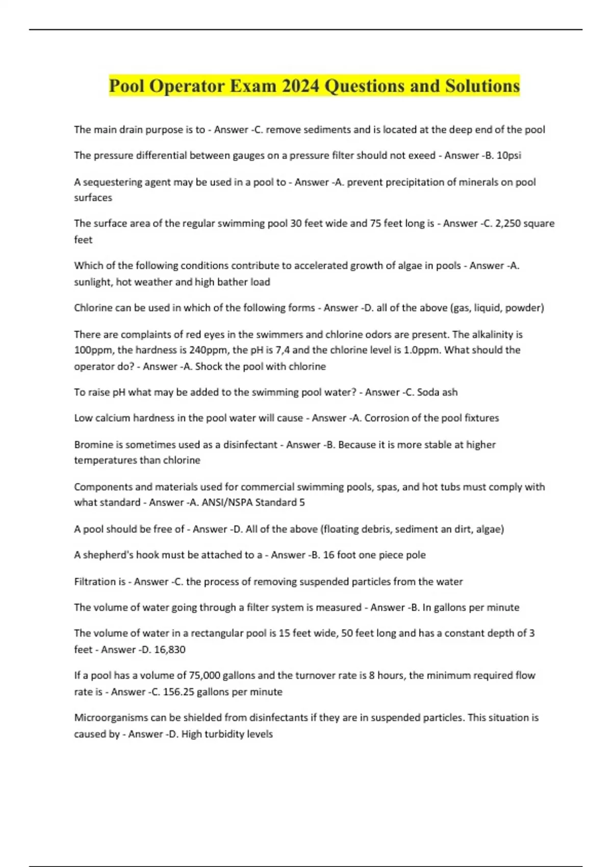 Pool Operator Exam 2024 Questions and Solutions The main drain purpose is to - Answer -C. remove sediments and is located at the deep end of the pool The pressure differential between gauges on a pressure filter should not exeed - Answer -B. 10psi A sequestering agent may be used in a pool to - Answer -A. prevent precipitation of minerals on pool surfaces The surface area of the regular swimming pool 30 feet wide and 75 feet long is - Answer -C. 2,250 square feet Which of the following conditions contribute to accelerated growth of algae in pools - Answer -A. sunlight, hot weather and high bather load Chlorine can be used in which of the following forms - Answer -D. all of the above (gas, liquid, powder) There are complaints of red eyes in the swimmers and chlorine odors are present. The alkalinity is 100ppm, the hardness is 240ppm, the pH is 7,4 and the chlorine level is 1.0ppm. What should the operator do? - Answer -A. Shock the pool with chlorine To raise pH what may be added to the swimming pool water? - Answer -C. Soda ash Low calcium hardness in the pool water will cause - Answer -A. Corrosion of the pool fixtures Bromine is sometimes used as a disinfectant - Answer -B. Because it is more stable at higher temperatures than chlorine Components and materials used for commercial swimming pools, spas, and hot tubs must comply with what standard - Answer -A. ANSI/NSPA Standard 5