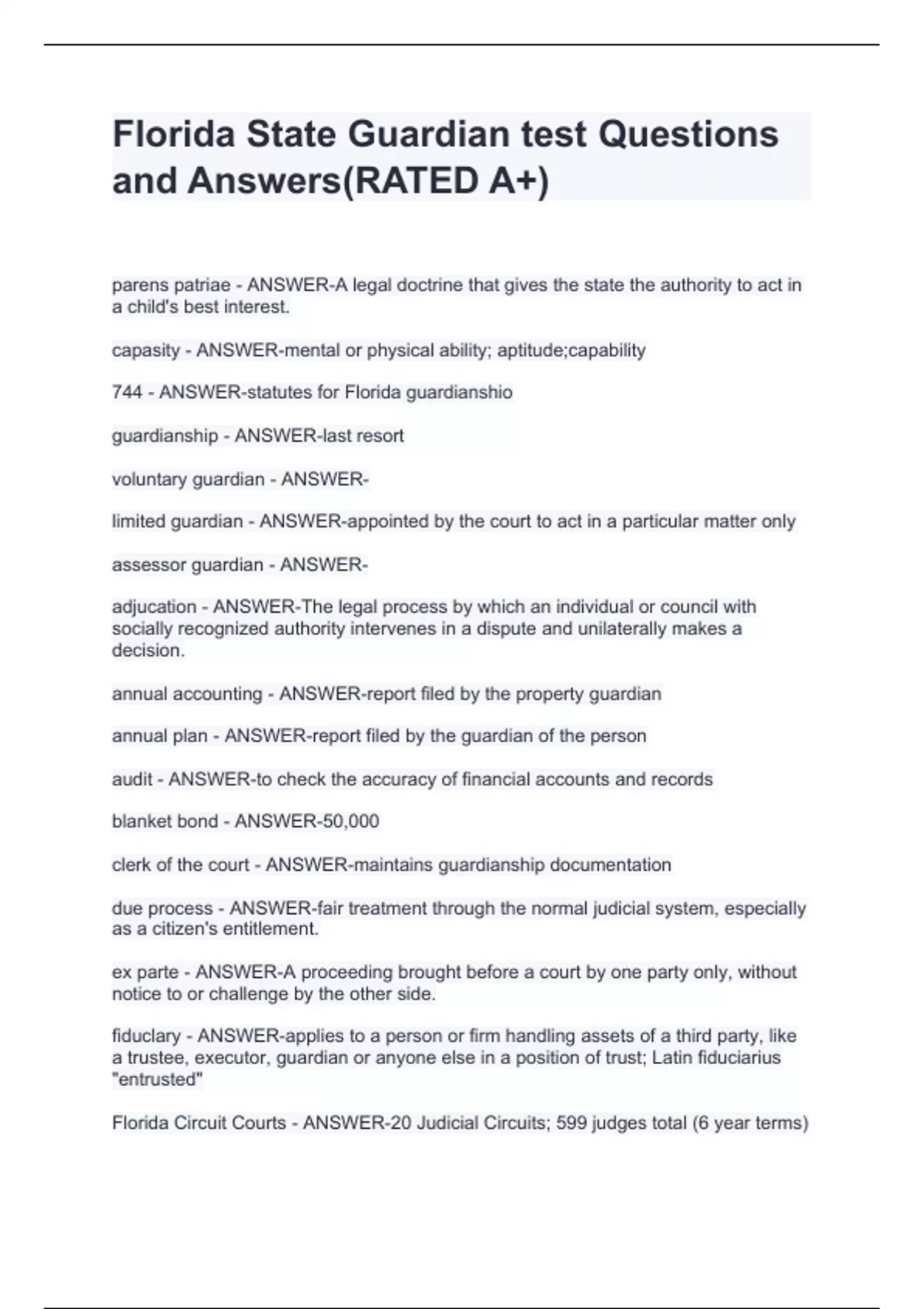 capasity - ANSWER-mental or physical ability; aptitude;capability 744 - ANSWER-statutes for Florida guardianshio guardianship - ANSWER-last resort voluntary guardian - ANSWER- limited guardian - ANSWER-appointed by the court to act in a particular matter only assessor guardian - ANSWER- adjucation - ANSWER-The legal process by which an individual or council with socially recognized authority intervenes in a dispute and unilaterally makes a decision. annual accounting - ANSWER-report filed by the property guardian annual plan - ANSWER-report filed by the guardian of the person audit - ANSWER-to check the accuracy of financial accounts and records blanket bond - ANSWER-50,000 clerk of the court - ANSWER-maintains guardianship documentation due process - ANSWER-fair treatment through the normal judicial system, especially as a citizen's entitlement. ex parte - ANSWER-A proceeding brought before a court by one party only, without notice to or challenge by the other side. fiduclary - ANSWER-applies to a person or firm handling assets of a third party, like a trustee, executor, guardian or anyone else in a position of trust; Latin fiduciarius "entrusted" Florida Circuit Courts - ANSWER-20 Judicial Circuits; 599 judges total (6 year terms) guardian ad litem - ANSWER-court appointed guardian to represent a minor or unborn child in litigation