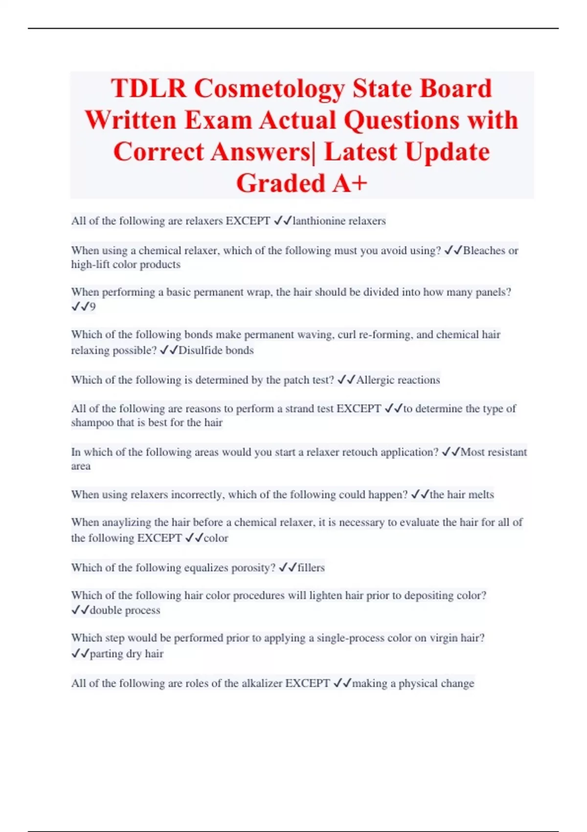 TDLR Cosmetology State Board Written Exam Actual Questions with Correct Answers| Latest Update Graded A+ All of the following are relaxers EXCEPT lanthionine relaxers When using a chemical relaxer, which of the following must you avoid using? Bleaches or high-lift color products When performing a basic permanent wrap, the hair should be divided into how many panels? 9 Which of the following bonds make permanent waving, curl re-forming, and chemical hair relaxing possible? Disulfide bonds Which of the following is determined by the patch test? Allergic reactions All of the following are reasons to perform a strand test EXCEPT to determine the type of shampoo that is best for the hair In which of the following areas would you start a relaxer retouch application? Most resistant area When using relaxers incorrectly, which of the following could happen? the hair melts When anaylizing the hair before a chemical relaxer, it is necessary to evaluate the hair for all of the following EXCEPT color Which of the following equalizes porosity? fillers Which of the following hair color procedures will lighten hair prior to depositing color? double process Which step would be performed prior to applying a single-process color on virgin hair? parting dry hai
