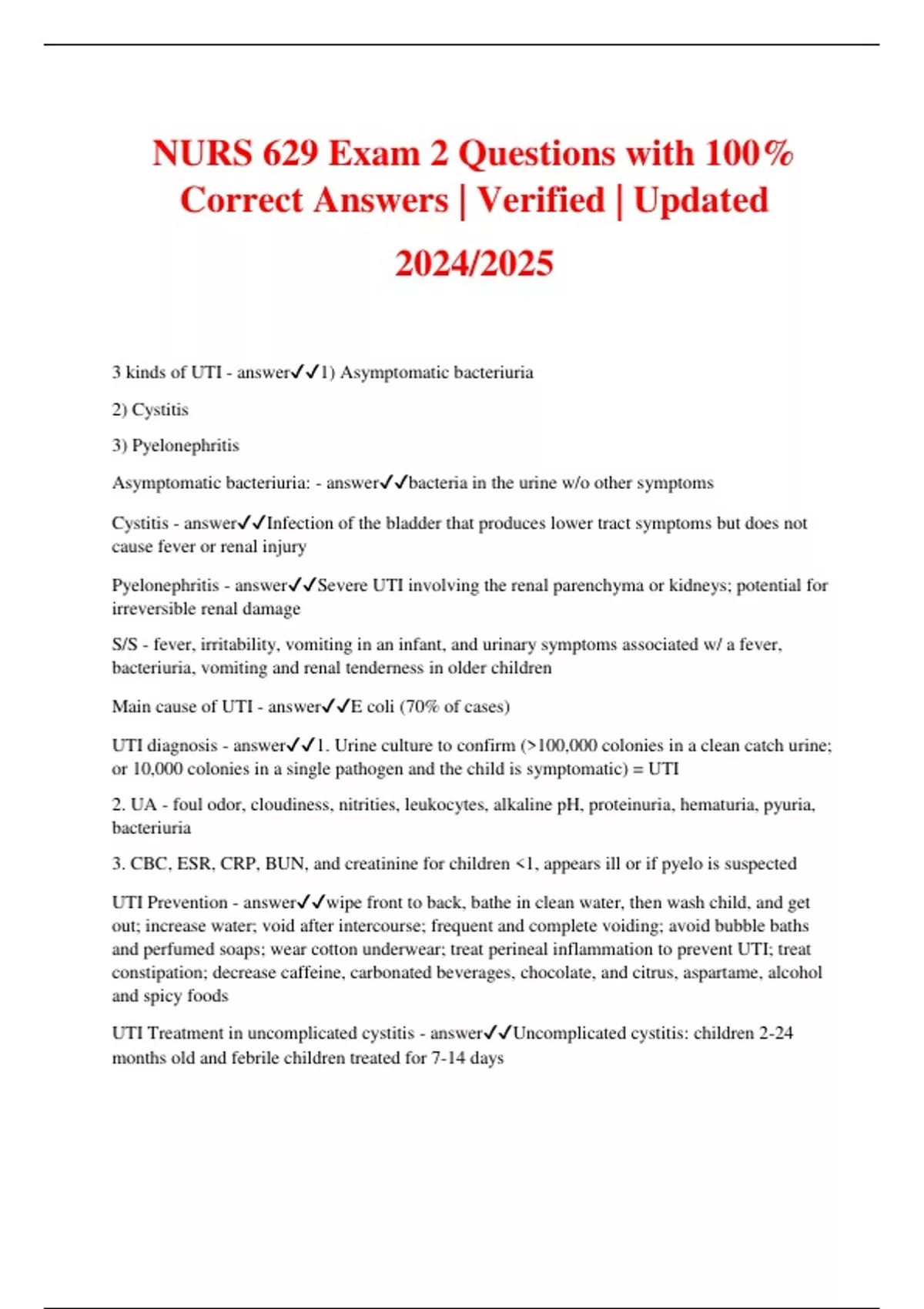 NURS 629 Exam 2 Questions with 100% Correct Answers | Verified | Updated 2024/2025 3 kinds of UTI - answer1) Asymptomatic bacteriuria 2) Cystitis 3) Pyelonephritis Asymptomatic bacteriuria: - answerbacteria in the urine w/o other symptoms Cystitis - answerInfection of the bladder that produces lower tract symptoms but does not cause fever or renal injury Pyelonephritis - answerSevere UTI involving the renal parenchyma or kidneys; potential for irreversible renal damage S/S - fever, irritability, vomiting in an infant, and urinary symptoms associated w/ a fever, bacteriuria, vomiting and renal tenderness in older children Main cause of UTI - answerE coli (70% of cases) UTI diagnosis - answer1. Urine culture to confirm (>100,000 colonies in a clean catch urine; or 10,000 colonies in a single pathogen and the child is symptomatic) = UTI 2. UA - foul odor, cloudiness, nitrities, leukocytes, alkaline pH, proteinuria, hematuria, pyuria, bacteriuria 3. CBC, ESR, CRP, BUN, and creatinine for children <1, appears ill or if pyelo is suspected UTI Prevention - answerwipe front to back, bathe in clean water, then wash child, and get out; increase water; void after intercourse; frequent and complete voiding; avoid bubble baths and perfumed soaps; wear cotton underwear; treat perineal inflammation to prevent UTI; treat constipation; decrease caffeine, carbonated beverages, chocolate, and citrus, aspartame, alcohol and spicy foods UTI Treatment in uncomplicated cystitis - answerUncomplicated cystitis: children 2-24 months old and febrile children treated for 7-14 days a. Trimethoprim-sulfamethoxazole (if >2 mo old) 8-12 mg/kg in 2 doses; adolescents - 160mg BID b. Amoxicillin c. Amoxicillin clavulanate d. Cephalexin e. Cefixime (if >6 mo old) f. Cefpodoxime proxetil (if >2 mo old) g. Ciprofloxacin (if >18 years) 500 mg once daily x3 days h. Nitrofurantoin (if >1 mo) UTI Treatment in Pyelonephritis - answera. Hospitalization if dehydrated, vomiting, or not drinking b. If uncomplicated = well hydrated, no vomiting, no abdominal pain = cefixime, ceftibuten, or amox clav c. Adolescents w/ uncomplicated = amox clav or ciprofloxacin Treatment of recurrent UTI - answerRenal and bladder ultrasound, if not done previously and voiding cystourethrogram (VCUG) What is GER? - answerRefers to the passage of gastric contents into the esophagus from the stomach through the LES; normal physiological process in healthy individuals What is GERD? - answerpresent when the reflux causes troublesome symptoms and/or complications; most common esophageal disorder in children GERD etiology - answerInappropriate relaxation of LES w/ failure to prevent gastric acid reflux into the esophagus, prolonged esophageal clearance of the gastric refluxate, and impaired esophageal mucosal barrier function 1. Infants have increased intraabdominal pressure because of their inability to sit upright; regurgitation is highest in the first month of life and decreases by 50% by the 5th month of life GER symptoms - answer1. Infancy = regurgitation; signs of esophagitis (irritability, arching, choking, gagging, feeding aversion); usually resolves 12-24 months of age 2. Child and adolescent = regurgitation during preschool years, complains of abdominal or chest pain, neck contortions (arching, turning of head), asthma, sinusitis, laryngitis 3. Symptoms in all children = regurgitation w/ or w/o vomiting; ruminative behavior; heartburn or chest pain; hematemesis; dysphagia; respiratory disorders (wheezing, stridor, cough, hoarseness, persistent throat clearing or cough); halitosis 4. Signs in all children = esophagitis, esophageal stricture, barrett esophagus, laryngeal/pharyngeal inflammation, recurrent pneumonia, anemia, dental erosion, apnea spells, apparent life-threatening events, weight loss or poor weight gain GERD diagnosis - answerBy history and physical exam; sometimes an empiric trial of acid suppression w/a PPI x 4 weeks may be used as a diagnostic test in older children and adolescents, but not recommended in infants and young children 1. Labs = obtain CBC w/ diff to r/o anemia and infection; UA and urine culture; stool for occult blood; testing for H. pylori 2. Gold standard to diagnose reflux - esophageal pH monitoring GERD management - answer1. H2RA and buffering agents - rapid onset of action, useful in on-demand treatment; result in tolerance ----H2RA examples: cimetidine, famotidine, nizatidine, ranitidine 2. PPI - superior to H2RAs in relieving symptoms and promoting mucosal healing and do not result in tolerance as do H2RA ----PPI examples: lansoprazole (prevacid), omeprazole (Prilosec), rabeprazole (aciphex), pantoprazole (protonix), esomeprazole (nexium) 3. Cytoprotective agent - sucralfate (Carafate) GERD: nutrition - answerthickening agents for formula in 1 tablespoon rice cereal/ounce formula reduce regurgitation but not significantly; no evidence to support dietary restrictions to decrease symptoms; avoid eating <2 hours before bedtime GERD lifestyle - answerWith GER, position infant in flat prone position after feeding if awake and being observed Position in flat supine position if sleeping Semi-sitting position applies abdominal pressure and causes more reflux; positioning infants upright may worsen reflux; Burp frequently during feeding Left-side positioning for older children during sleep or elevation of the head of the bed What is Celiac disease? - answerImmune-mediated systemic disorder triggered by dietary exposure to wheat gluten and related proteins in barley and rye What is celiac characterized by? - answerCharacterized by the presence of a variable combination of gluten-dependent clinical manifestations, celiac disease-specific antibodies, HLA-DQ2.5 or HLA-DQ8 haplotypes, and enteropathy