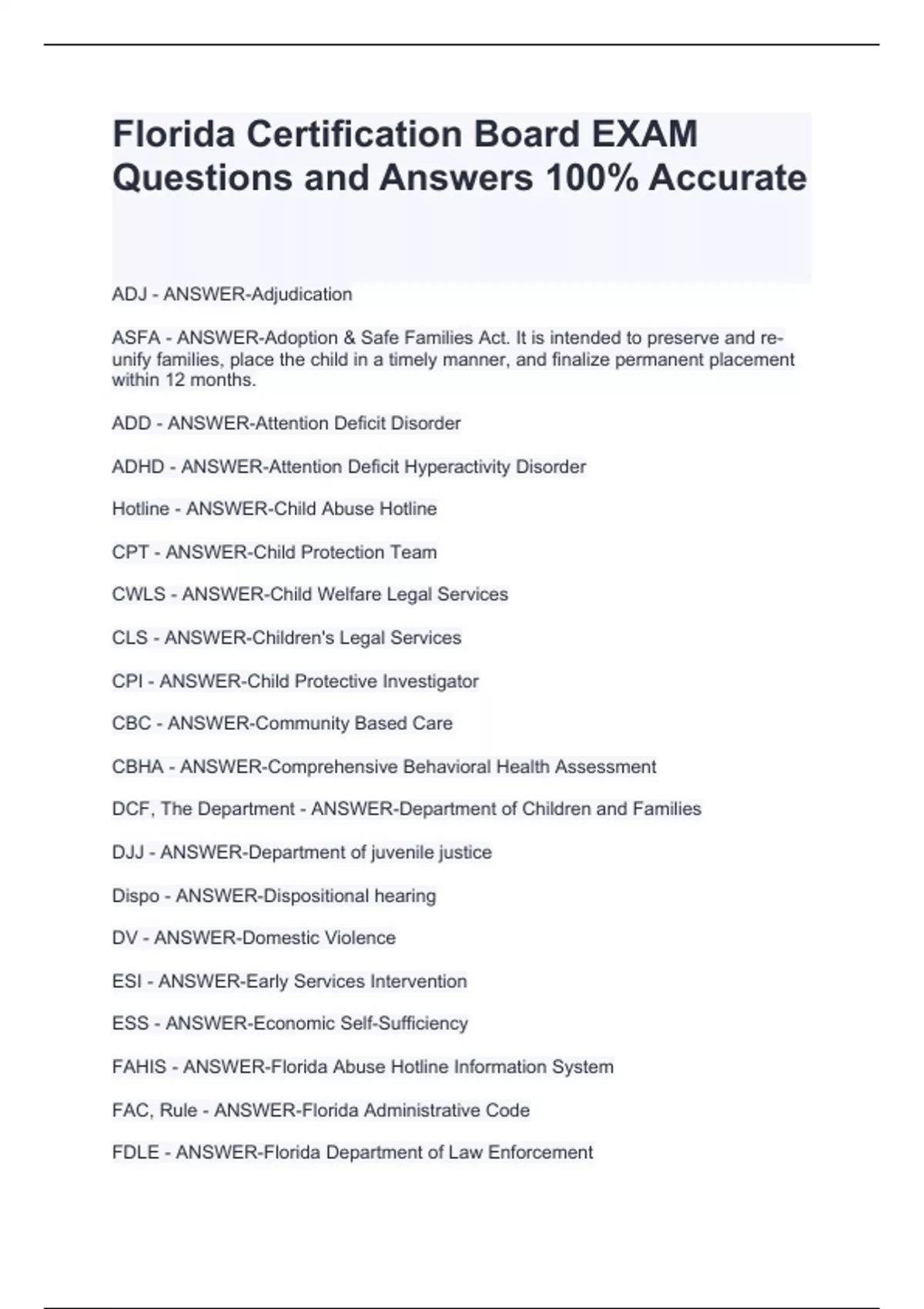ASFA - ANSWER-Adoption & Safe Families Act. It is intended to preserve and re-unify families, place the child in a timely manner, and finalize permanent placement within 12 months. ADD - ANSWER-Attention Deficit Disorder ADHD - ANSWER-Attention Deficit Hyperactivity Disorder Hotline - ANSWER-Child Abuse Hotline CPT - ANSWER-Child Protection Team CWLS - ANSWER-Child Welfare Legal Services CLS - ANSWER-Children's Legal Services CPI - ANSWER-Child Protective Investigator CBC - ANSWER-Community Based Care CBHA - ANSWER-Comprehensive Behavioral Health Assessment DCF, The Department - ANSWER-Department of Children and Families DJJ - ANSWER-Department of juvenile justice Dispo - ANSWER-Dispositional hearing DV - ANSWER-Domestic Violence ESI - ANSWER-Early Services Intervention ESS - ANSWER-Economic Self-Sufficiency FAHIS - ANSWER-Florida Abuse Hotline Information System FAC, Rule - ANSWER-Florida Administrative Code FDLE - ANSWER-Florida Department of Law Enforcement