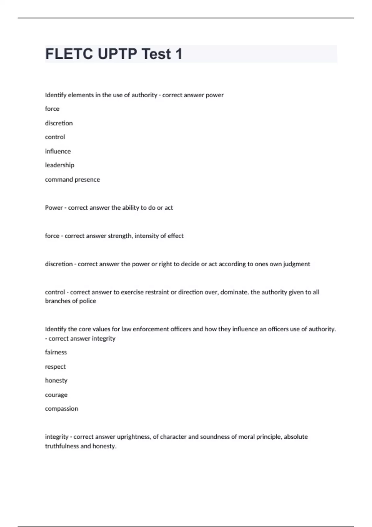 Identify elements in the use of authority - correct answer power force discretion control influence leadership command presence Power - correct answer the ability to do or act force - correct answer strength, intensity of effect discretion - correct answer the power or right to decide or act according to ones own judgment control - correct answer to exercise restraint or direction over, dominate. the authority given to all branches of police Identify the core values for law enforcement officers and how they influence an officers use of authority. - correct answer integrity fairness respect honesty courage compassion integrity - correct answer uprightness, of character and soundness of moral principle, absolute tr