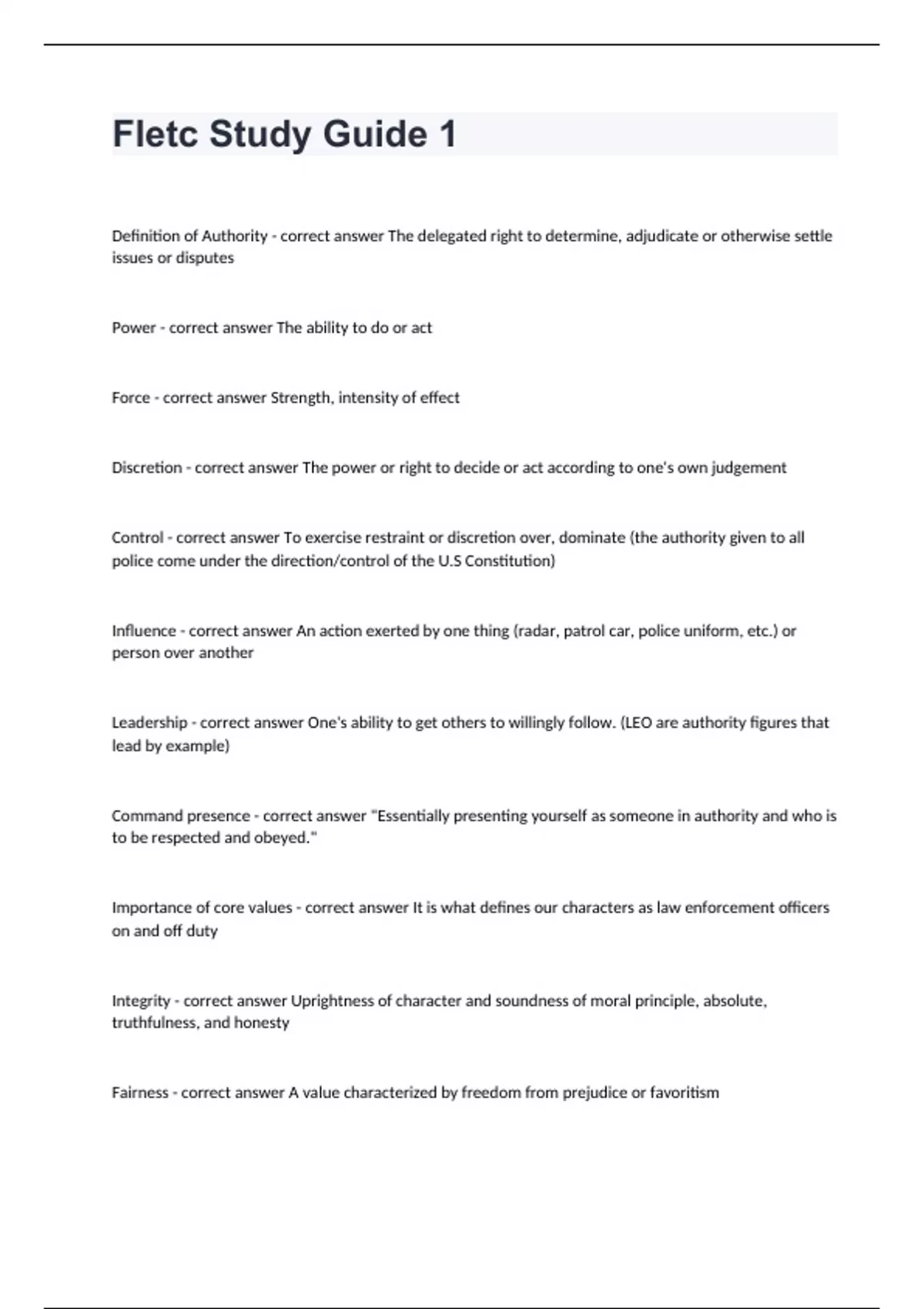 Definition of Authority - correct answer The delegated right to determine, adjudicate or otherwise settle issues or disputes Power - correct answer The ability to do or act Force - correct answer Strength, intensity of effect Discretion - correct answer The power or right to decide or act according to one's own judgement Control - correct answer To exercise restraint or discretion over, dominate (the authority given to all police come under the direction/control of the U.S Constitution) Influence - correct answer An action exerted by one thing (radar, patrol car, police uniform, etc.) or person over another Leadership - correct answer One's ability to get others to willingly follow. (LEO are authority figures that lead by example) Command presence - correct answer "Essentially presenting yourself as someone in authority and who is t