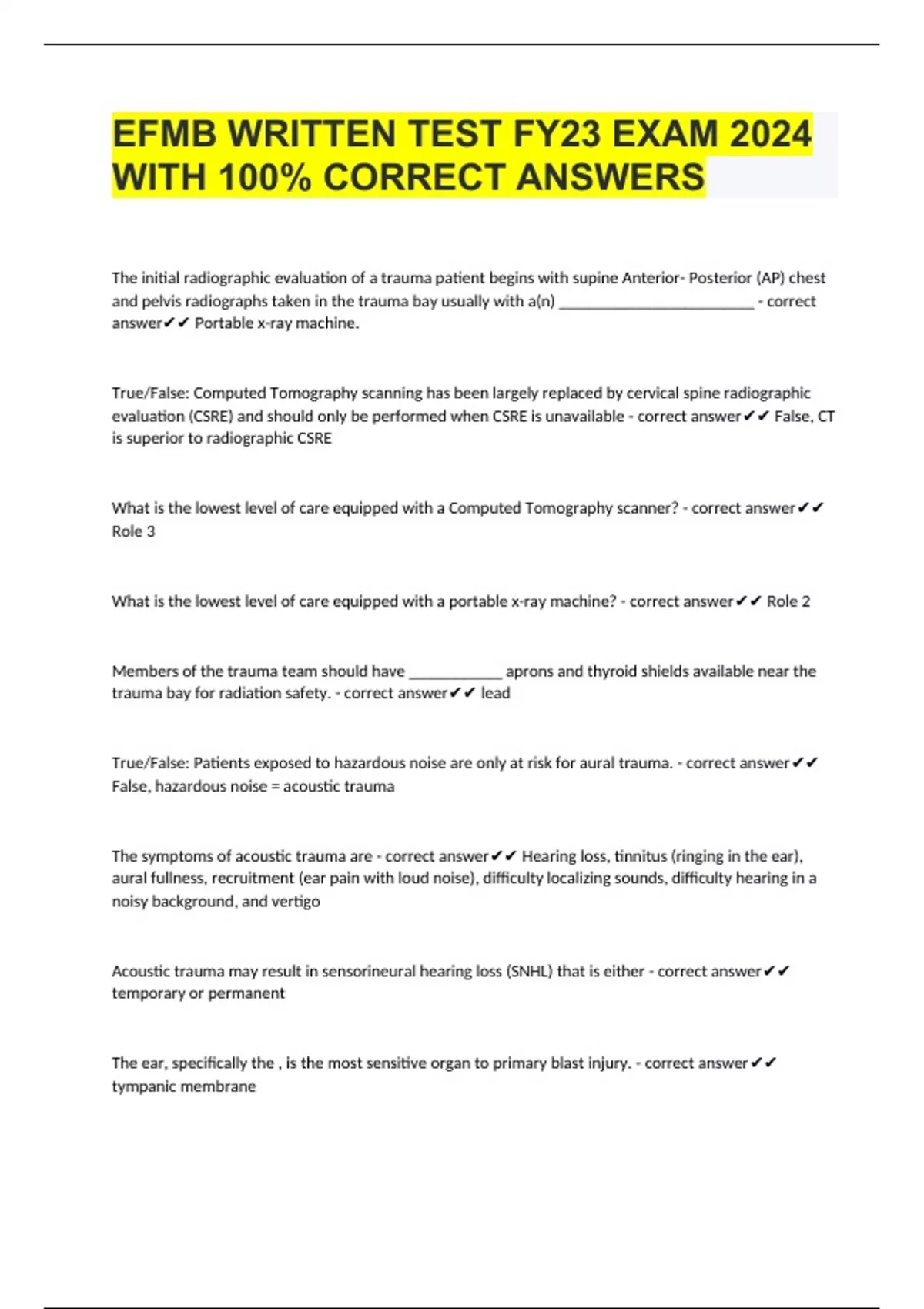The initial radiographic evaluation of a trauma patient begins with supine Anterior- Posterior (AP) chest and pelvis radiographs taken in the trauma bay usually with a(n) _______________________ - correct answer Portable x-ray machine. True/False: Computed Tomography scanning has been largely replaced by cervical spine radiographic evaluation (CSRE) and should only be performed when CSRE is unavailable - correct answer False, CT is superior to radiographic CSRE What is the lowest level of care equipped with a Computed Tomography scanner? - correct answer Role 3 What is the lowest level of care equipped with a portable x-ray machine? - correct answer Role 2 Members of the trauma team should have ___________ aprons and thyroid shields available near the trauma bay for radiation safety. - correct answer lead True/False: Patients exposed to hazardous noise are only at risk for aural trauma. - correct answer False, hazardous noise = acoustic trauma The symptoms of acoustic trauma are - correct answer Hearing loss, tinnitus (ringing in the ear), aural fullness, recruitment (ear pain with loud noise), difficulty localizing sounds, difficulty hearing in a noisy background, and vertigo