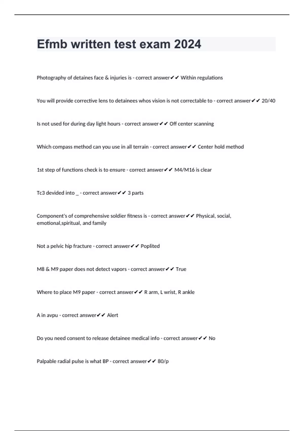 Photography of detaines face & injuries is - correct answer Within regulations You will provide corrective lens to detainees whos vision is not correctable to - correct answer 20/40 Is not used for during day light hours - correct answer Off center scanning Which compass method can you use in all terrain - correct answer Center hold method 1st step of functions check is to ensure - correct answer M4/M16 is clear Tc3 devided into _ - correct answer 3 parts Component's of comprehensive soldier fitness is - correct answer Physical, social, emotional,spiritual, and family Not a pelvic hip fracture - correct answer Poplited M8