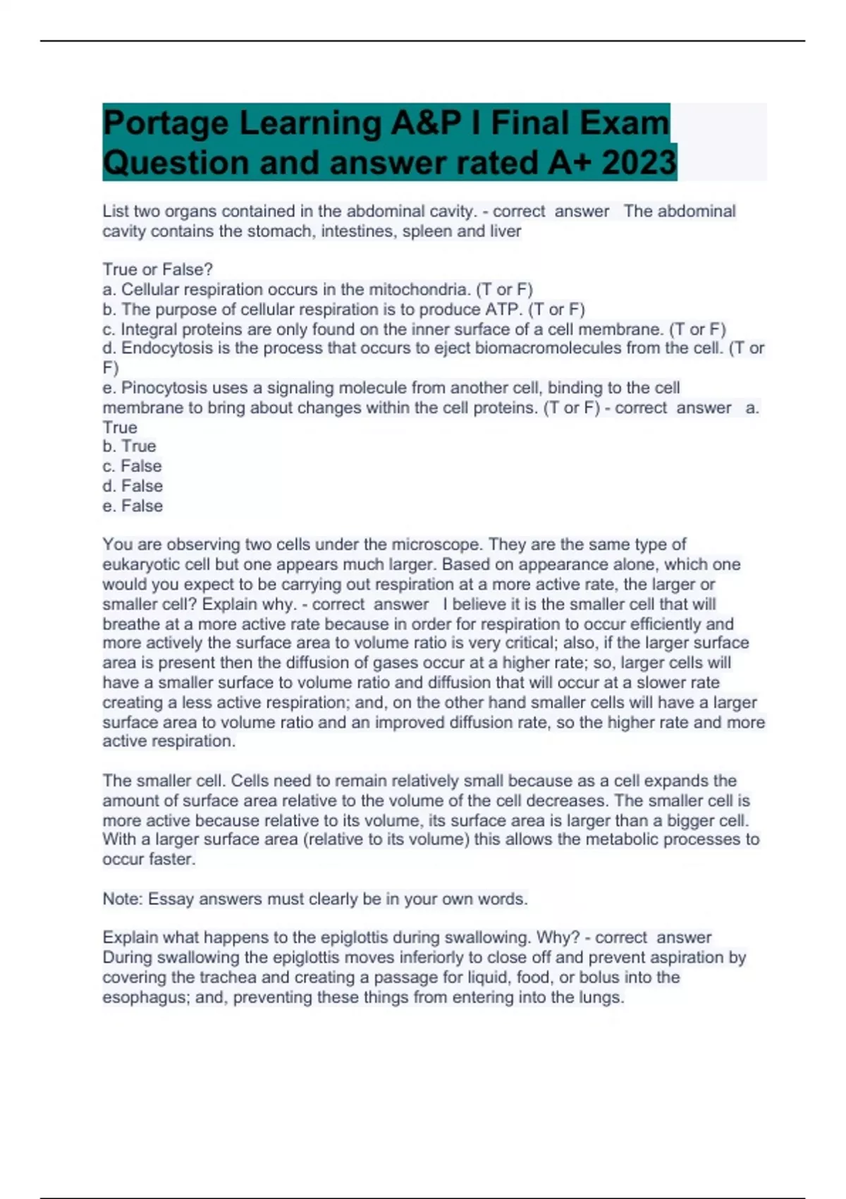Portage Learning Question and answers correctly solved 2024 List two organs contained in the abdominal cavity. - correct answer The abdominal cavity contains the stomach, intestines, spleen and liver True or False? a. Cellular respiration occurs in the mitochondria. (T or F) b. The purpose of cellular respiration is to produce ATP. (T or F) c. Integral proteins are only found on the inner surface of a cell membrane. (T or F) d. Endocytosis is the process that occurs to eject biomacromolecules from the cell. (T or F) e. Pinocytosis uses a signaling molecule from another cell, binding to the cell membrane to bring about changes within the cell proteins. (T or F) - correct answer a. True b. True c. False d. False e. False You are observing two cells under the microscope. They are the same type of eukaryotic cell but one appears much larger. Based on appearance alone, which one would you expect to be carrying out respiration at a more active rate, the larger or smaller cell? Explain why. - correct answer I believe it is the smaller cell that will breathe at a more active rate because in order for respiration to occur efficiently and more actively the surface area to volume ratio is very critical; also, if the larger surface area is present then the diffusion of gases occur at a higher rate; so, larger cells will have a smaller surface to volume ratio and diffusion that will occur at a slower rate creating a less active respiration; and, on the other hand smaller cells will have a larger surface area to volume ratio and an improved diffusion rate, so the higher rate and more active respiration. The smaller cell. Cells need to remain relatively small because as a cell expands the amount of surface area relative to the volume of the cell decreases. The smaller cell is more active because relative to its volume, its surface area is larger than a bigger cell. With a larger surfa
