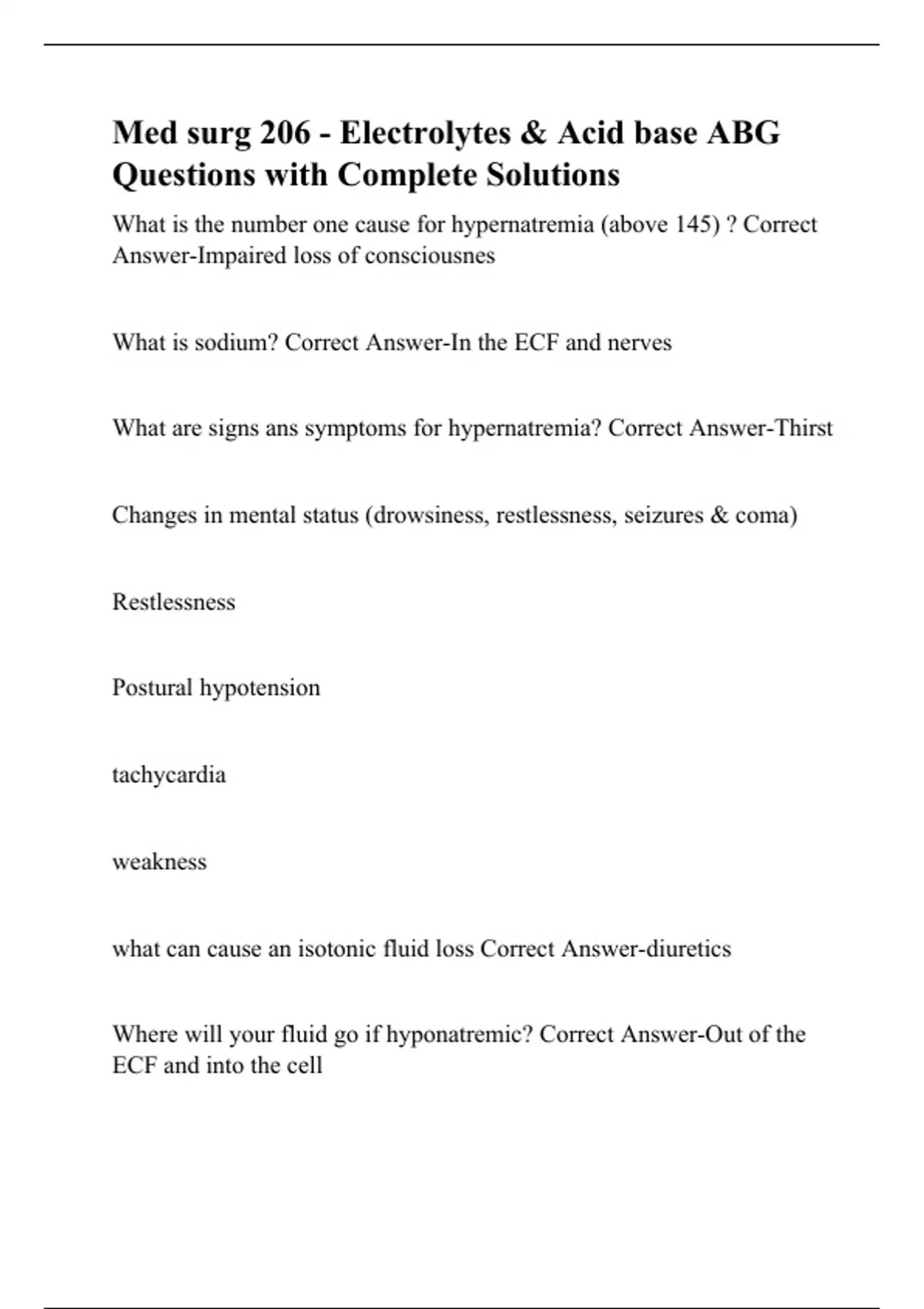 MED SURG 206 Jersey College Of Nursing -Med surg 206 - Electrolytes & Acid base ABG Questions with Complete Solutions
