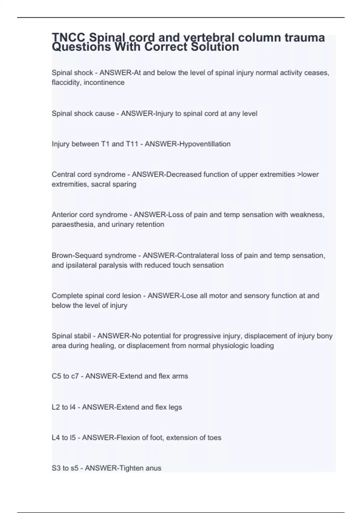 Spinal shock - ANSWER-At and below the level of spinal injury normal activity ceases, flaccidity, incontinence Spinal shock cause - ANSWER-Injury to spinal cord at any level Injury between T1 and T11 - ANSWER-Hypoventillation Central cord syndrome - ANSWER-Decreased function of upper extremities >lower extremities, sacral sparing Anterior cord syndrome - ANSWER-Loss of pain and temp sensation with weakness, paraesthesia, and urinary retention Brown-Sequard syndrome - ANSWER-Contralateral loss of pain and temp sensation, and ipsilateral paralysis with reduced touch sensation Complete spinal cord lesion - ANSWER-Lose all motor and sensory function at and below the level of injury Spinal stabil - ANSWER-No potential for progressive injury, displacement of injury bony area during healing, or displacement from normal physiologic loading C5 to c7 - ANSWER-Extend and flex arms L2 to l4 - ANSWER-Extend and flex legs L4 to l5 - ANSWER-Flexion of foot, extension of toes