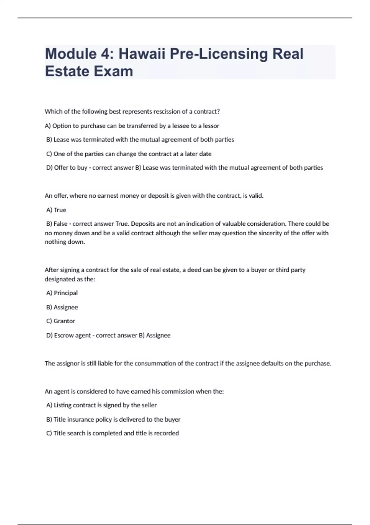 Module 4 Hawaii Pre-Licensing Real Estate Exam With Complete Answers 2024. Which of the following best represents rescission of a contract? A) Option to purchase can be transferred by a lessee to a lessor B) Lease was terminated with the mutual agreement of both parties C) One of the parties can change the contract at a later date D) Offer to buy - correct answer B) Lease was terminated with the mutual agreement of both parties An offer, where no earnest money or deposit is given with the contract, is valid. A) True B) False - correct answer True. Deposits are not an indication of valuable consideration. There could be no money down and be a valid contract although the seller may question the sincerity of the offer with nothing down. After signing a contract for the sale of real estate, a deed can be given to a buyer or third party designated as the: A) Principal B) Assignee C) Grantor D) Escrow agent - correct answer B) Assignee The assignor is still liable for the consummation of the contract if the assignee defaults on the purchase. An agent is considered to have earned his commission when the: A) Listing contract is signed by the seller B) Title insurance policy is delivered to the buyer C) Title search is completed and title is recorded