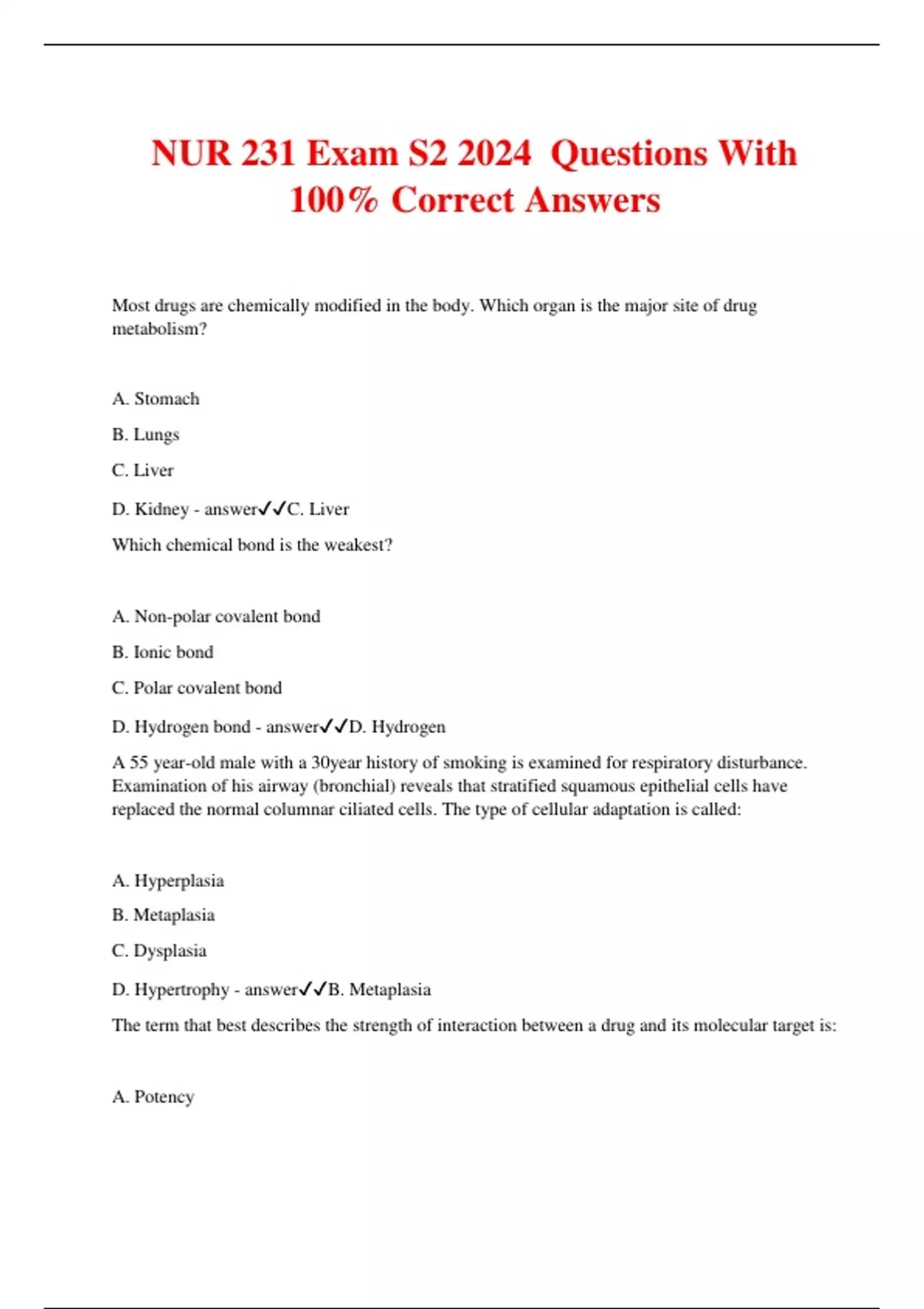 NUR 231 Exam S2 2024 Questions With 100% Correct Answers Most drugs are chemically modified in the body. Which organ is the major site of drug metabolism? A. Stomach B. Lungs C. Liver D. Kidney - answerC. Liver Which chemical bond is the weakest? A. Non-polar covalent bond B. Ionic bond C. Polar covalent bond D. Hydrogen bond - answerD. Hydrogen A 55 year-old male with a 30year history of smoking is examined for respiratory disturbance. Examination of his airway (bronchial) reveals that stratified squamous epithelial cells have replaced the normal columnar ciliated cells. The type of cellular adaptation is called: A. Hyperplasia B. Metaplasia C. Dysplasia D. Hypertrophy - answerB. Metaplasia The term that best describes the strength of interaction between a drug and its molecular target is: A. Potency B. Selectivity C. Specificity D. Affinity - answerD. Affinity Gradual decrease in the effectiveness of an opioid analgesic given repeatedly over a period is best defined as? A. Upregulation B. Dependence C. Tolerance D. Antagonism - answerC. Tolerance Ingestion of 20 or more paracetamol tablets (10g) can cause the adverse effect: A. Hepatotoxicity B. Gastrointestinal tract disorders C. Hypertension D. Neurotoxicity - answerA. Hepatotoxicity Apoptosis is a condition in which cells program themselves to: A. Age B. Die C. Atrophy D. Regenerate - answerB. Die Pain that is felt in a different body part tot he source of the pain is called: A. Neuropathic pain B. Referred pain C. Hyperalgesia D. Psychogenic pain - answerB. Referred pain A 20-year-old male was brought in tot he ED for severe burns. He requested something for the excruciating pain he was experiencing. Blocking which of the following neurotransmitters would reduce his pain? A. Enkephalin B. Acetylcholine C. Dopamine D Substance P - answerA. Substance P Which division of the nervous system controls heart rate? A. Sensory B. Somatic C. Autonomic D. Afferent - answerC. Autonomic A patient who has diarrhoea receives a hypertonic saline solution intravenously to replace the sodium and chloride lost in the stool. What effect will this fluid replacement have on cells? A. Cells will shrink B. Cells will swell or burst C. Cells will become hydrated D. Cells will divide - answerA. Cells will shrink A 75-year-old female with Alzheimer's disease has increased lipid peroxidation secondary to free-radical production. Lipid peroxidation results in: A. Organelle membrane reconstruction B. Increased lipid transportation C. Cell membrane damage D. Increased protein synthesis - answerC. Cell membrane damage NSAID's peripherally inhibit the synthesis and release of prostaglandins (PG's) by inhibiting: