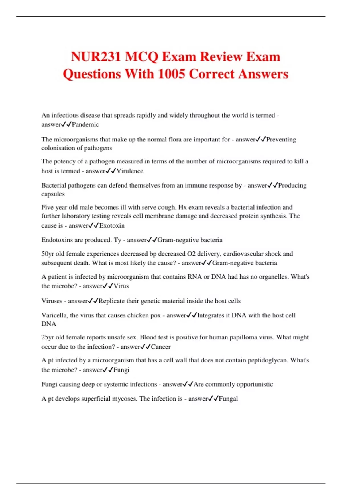 NUR231 MCQ Exam Review Exam Questions With 1005 Correct Answers