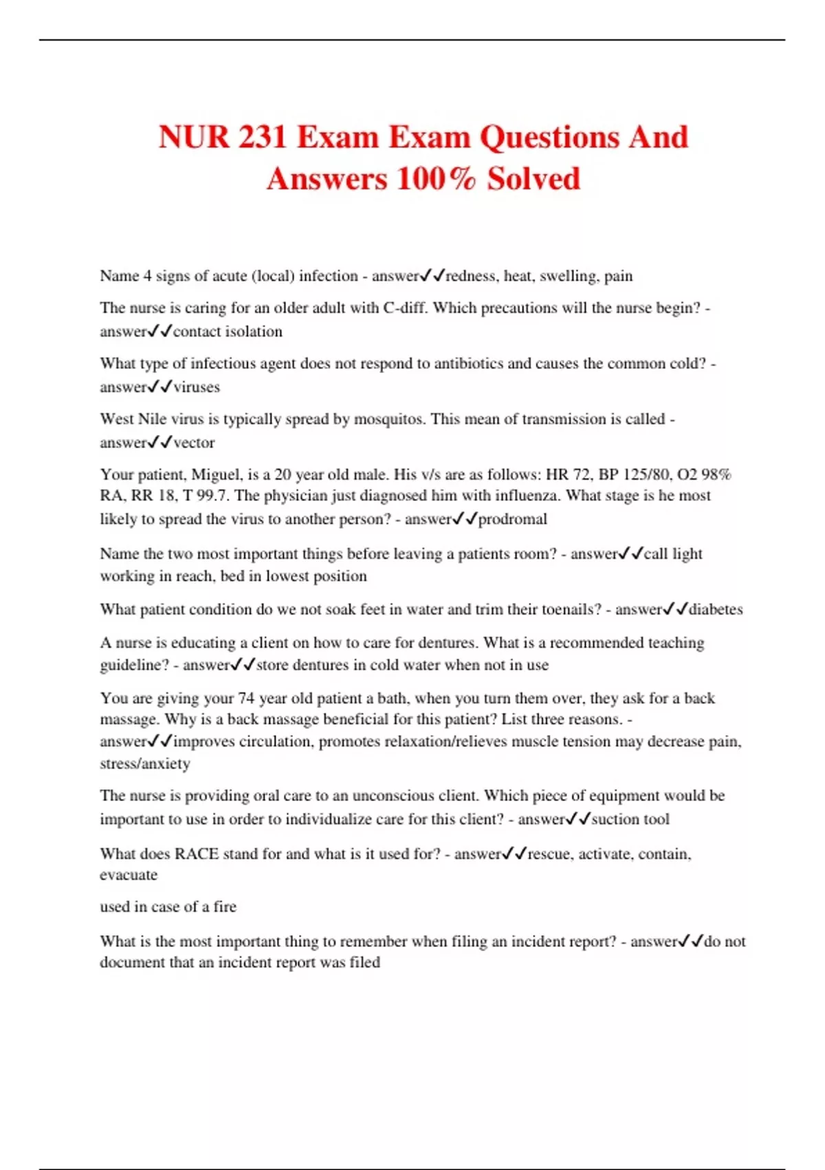 NUR 231 Exam Exam Questions And Answers 100% Solved Name 4 signs of acute (local) infection - answerredness, heat, swelling, pain The nurse is caring for an older adult with C-diff. Which precautions will the nurse begin? - answercontact isolation What type of infectious agent does not respond to antibiotics and causes the common cold? - answerviruses West Nile virus is typically spread by mosquitos. This mean of transmission is called - answervector Your patient, Miguel, is a 20 year old male. His v/s are as follows: HR 72, BP 125/80, O2 98% RA, RR 18, T 99.7. The physician just diagnosed him with influenza. What stage is he most likely to spread the virus to another person? - answerprodromal Name the two most important things before leaving a patients room? - answercall light working in reach, bed in lowest position What patient condition do we not soak feet in water and trim their toenails? - answerdiabetes A nurse is educating a client on how to care for dentures. What is a recommended teaching guideline? - answerstore dentures in cold water when not in use You are giving your 74 year old patient a bath, when you turn them over, they ask for a back massage. Why is a back massage beneficial for this patient? List three reasons. - answerimproves circulation, promotes relaxation/relieves muscle tension may decrease pain, stress/anxiety The nurse is providing oral care to an unconscious client. Which piece of equipment would be important to use in order to individualize care for this client? - answersuction tool What does RACE stand for and what is it used for? - answerrescue, activate, contain, evacuate used in case of a fire What is the most important thing to remember when filing an incident report? - answerdo not document that an incident report was filed