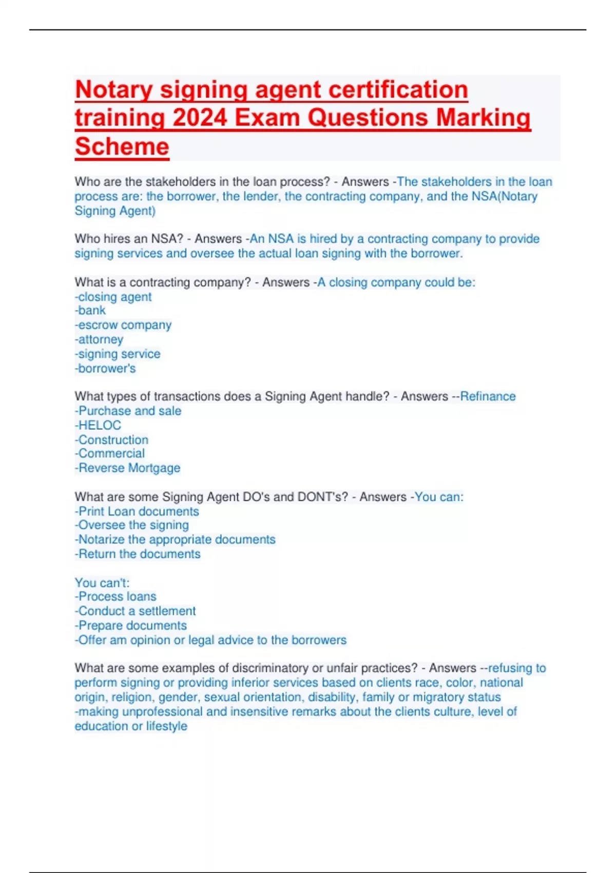 Notary signing agent certification training 2024 Exam Questions Marking Scheme Who are the stakeholders in the loan process? - Answers -The stakeholders in the loan process are: the borrower, the lender, the contracting company, and the NSA(Notary Signing Agent) Who hires an NSA? - Answers -An NSA is hired by a contracting company to provide signing services and oversee the actual loan signing with the borrower. What is a contracting company? - Answers -A closing company could be: -closing agent -bank -escrow company -attorney -signing service -borrower's What types of transactions does a Signing Agent handle? - Answers --Refinance -Purchase and sale -HELOC -Construction -Commercial -Reverse Mortgage What are some Signing Agent DO's and DONT's? - Answers -You can: -Print Loan documents -Oversee the signing -Notarize the appropriate documents -Return the documents You can't: -Process loans -Conduct a settlement -Prepare documents -Offer am opinion or legal advice to the borrowers What are some examples of discriminatory or unfair practices? - Answers --refusing to perform signing or providing inferior services based on clients race, color, national origin, religion, gender, sexual orientation, disability, family or migratory status -making unprofessional and insensitive remarks about the clients culture, level of education or lifestyle -Prompting the perception of unwelcome advances or a lewd act Where does the NSA fit in the loan process? - Answers -You may be the first or the only person the borrower meets. Although you are involved in only one step, the whole loan process hinges on how well you do your job. What are the key responsibilities of a Signing Agent? - Answers -Key responsibilities: -Travel to the borrower -Oversee the Signing -Collect stipulations and notarize applicable documents -Ensure that the documents are signed, dated or initialed properly -Review all the documents -Return the documents to the contracting company. How does a Signing Agent's performance affect the SLA(Service Level Agreement)? - Answers -Your poor performance can negatively affect the payment to the contracting company How can a Signing Agent provide superior customer service - Answers -You can: -Be positive and Confident -Be Prompt -Be accurate -Be dependable