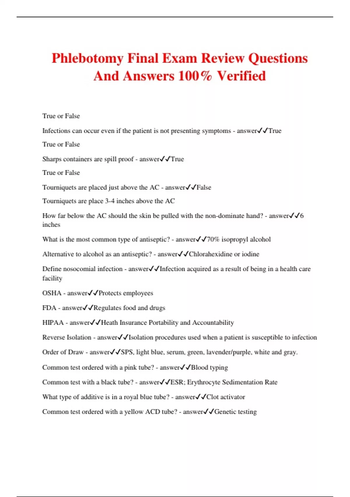 Phlebotomy Final Exam Review Questions And Answers 100% Verified True or False Infections can occur even if the patient is not presenting symptoms - answerTrue True or False Sharps containers are spill proof - answerTrue True or False Tourniquets are placed just above the AC - answerFalse Tourniquets are place 3-4 inches above the AC How far below the AC should the skin be pulled with the non-dominate hand? - answer6 inches What is the most common type of antiseptic? - answer70% isopropyl alcohol Alternative to alcohol as an antiseptic? - answerChlorahexidine or iodine Define nosocomial infection - answerInfection acquired as a result of being in a health care facility OSHA - answerProtects employees FDA - answerRegulates food and drugs HIPAA - answerHeath Insurance Portability and Accountability Reverse Isolation - answerIsolation procedures used when a patient is susceptible to infection Order of Draw - answerSPS, light blue, serum, green, lavender/purple, white and gray. Common test ordered with a pink tube? - answerBlood typing Common test with a black tube? - answerESR; Erythrocyte Sedimentation Rate What type of additive is in a royal blue tube? - answerClot activator Common test ordered with a yellow ACD tube? - answerGenetic testing