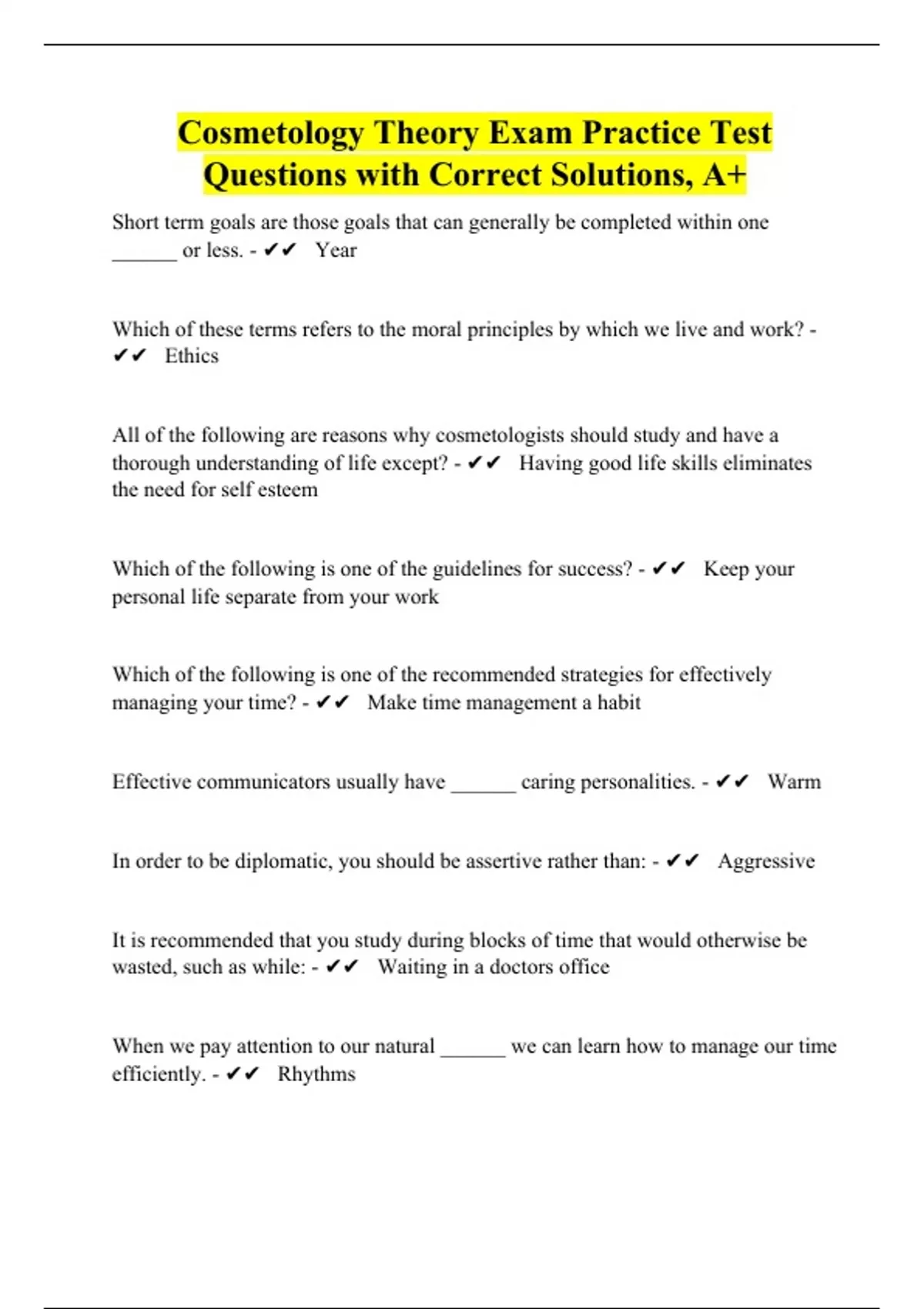 Short term goals are those goals that can generally be completed within one ______ or less. - Year Which of these terms refers to the moral principles by which we live and work? - Ethics All of the following are reasons why cosmetologists should study and have a thorough understanding of life except? - Having good life skills eliminates the need for self esteem Which of the following is one of the guidelines for success? - Keep your personal life separate from your work Which of the following is one of the recommended strategies for effectively managing your time? - Make time management a habit Effective communicators usually have ______ caring personalities. - Warm In order to be diplomatic, you should be assertive rather than: - Aggressive It is recommended that you study during blocks of time that would otherwise be wasted, such as while: - Waiting in a doctors office When we pay attention to our natural ______ we can learn how to manage our time efficiently. - Rhythms Unfortunately, even if you are creative enough, talented enough, and motivated enough, you will still run into ______ as a cosmetologist. - Difficulties An unhealthy compulsion to do things perfectly is called: - Perfectionism The conscious act of planning your life instead of just letting things happen is described as having: - A game plan The thing that propels you to do something is: - Motivation Putting off until tomorrow what you can do today is called: - Procrastination Self-_________ involves knowing what you want to achieve and keeping yourself on track so that you do eventually achieve your goal. - Management Your clothing should always be stylish and: - Functional An important aspect of professional image is: - Physical presentation The key to prevent repetitive motion injury is to be aware of: - Body posture and movements Behaving _________ includes having a genuine interest in your own day to day activities as well as being concerned about and for others. - Professionally Your back and shoulders should be relaxed and ________ when you are providing client services. - Level Open toed sandals are _______ footwear when working in a salon. - Inappropriate The science of how a workplace can best be designed for comfort, safety, efficiency, and productivity is: - Ergonomics The daily maintenance of cleanliness is: - personal hygiene The impression you project through your outward appearance and conduct in the workplace is your: - Professional presentation Your posture and the way you walk and move are part of your: - physical presentation People who create conflict wherever they go typically do so because they are feeling: - Insecure
