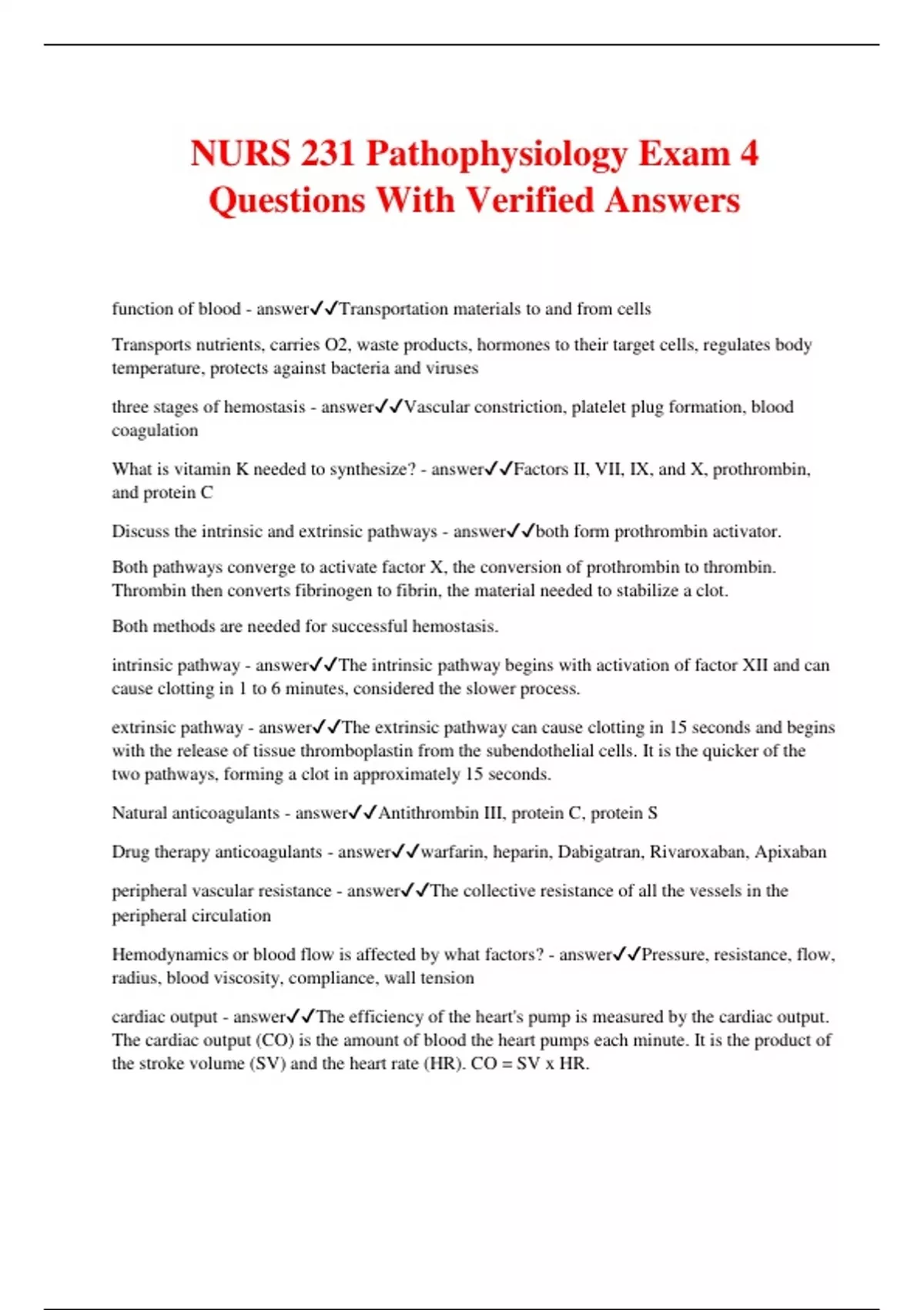 NURS 231 Pathophysiology Exam 4 Questions With Verified Answers function of blood - answerTransportation materials to and from cells Transports nutrients, carries O2, waste products, hormones to their target cells, regulates body temperature, protects against bacteria and viruses three stages of hemostasis - answerVascular constriction, platelet plug formation, blood coagulation What is vitamin K needed to synthesize? - answerFactors II, VII, IX, and X, prothrombin, and protein C Discuss the intrinsic and extrinsic pathways - answerboth form prothrombin activator. Both pathways converge to activate factor X, the conversion of prothrombin to thrombin. Thrombin then converts fibrinogen to fibrin, the material needed to stabilize a clot. Both methods are needed for successful hemostasis. intrinsic pathway - answerThe intrinsic pathway begins with activation of factor XII and can cause clotting in 1 to 6 minutes, considered the slower process. extrinsic pathway - answerThe extrinsic pathway can cause clotting in 15 seconds and begins with the release of tissue thromboplastin from the subendothelial cells. It is the quicker of the two pathways, forming a clot in approximately 15 seconds. Natural anticoagulants - answerAntithrombin III, protein C, protein S Drug therapy anticoagulants - answerwarfarin, heparin, Dabigatran, Rivaroxaban, Apixaban peripheral vascular resistance - answerThe collective resistance of all the vessels in the peripheral circulation Hemodynamics or blood flow is affected by what factors? - answerPressure, resistance, flow, radius, blood viscosity, compliance, wall tension cardiac output - answerThe efficiency of the heart's pump is measured by the cardiac output. The cardiac output (CO) is the amount of blood the heart pumps each minute. It is the product of the stroke volume (SV) and the heart rate (HR). CO = SV x HR. preload - answerPreload is the end-diastolic pressure when the ventricle has been filled and represents the volume work of the heart. afterload - answerpressure the heart must generate to move blood into the aorta. cardiac contractility - answerability of the heart to change its force of contraction without changing its resting (diastolic) length. inotrope - answerAn inotropic influence is one that increases the strength of the muscular contraction. mean arterial pressure - answeraverage pressure in the arterial system during ventricular contraction and relaxation. It is a good indicator of tissue perfusion. MAP = CO x PVR Understand the renin-angiotensin-aldosterone system in figure 4.9. - answerThe renin- angiotensin-aldosterone system plays a vital role in blood pressure regulation. If there are changes in extracellular fluid, extracellular sodium levels, a drop in blood pressure, or increased sympathetic activity, the kidney will release renin. Once in the bloodstream, renin converts angiotensinogen (a plasma protein) to angiotensin I. Angiotensin I is then converted to angiotensin II in the lungs by the angiotensin-converting enzyme (ACE). Angiotensin II is a potent vasoconstrictor, mainly of the arterioles, and to some extent, the veins. Arteriole constriction will increase the PVR, regulating blood pressure for a short period of time. Angiotensin II also stimulates the adrenal gland to secrete aldosterone. Aldosterone will increase salt and water retention by the kidney contributing to the long-term regulation of blood pressure. Figure 4.9 summarizes the control of blood pressure by the renin-angiotensin-aldosterone system. Be familiar with hypercoagulability states in table 4.2. - answerIncreased Platelet Function: Reactive disorders (iron deficiency anemia, splenectomy, chronic inflammation) Myeloproliferative disorders (polycythemia vera) Atherosclerosis Diabetes mellitus Smoking Elevated cholesterol levels Increased platelet levels Accelerated Activity of the Clotting System Inherited disorders (primary): Mutation of factor V Leiden
