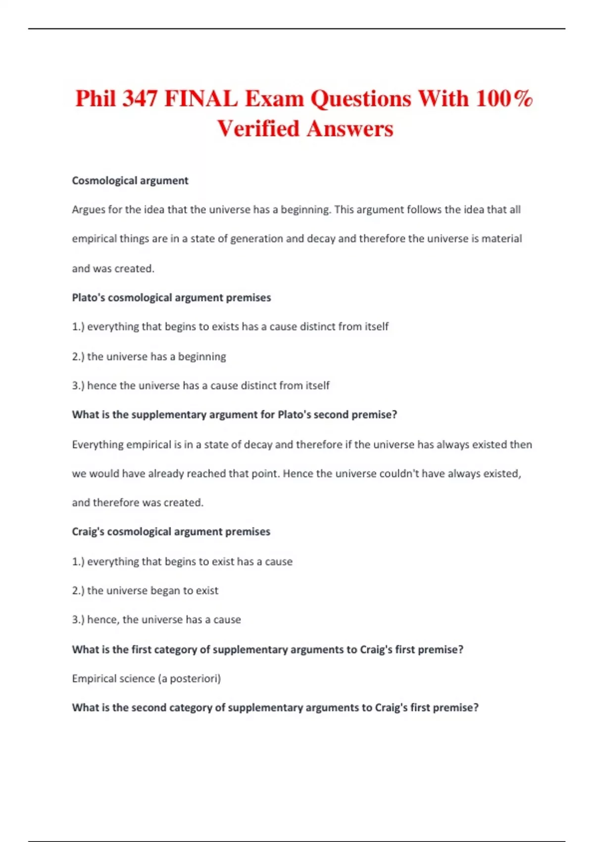 Phil 347 FINAL Exam Questions With 100% Verified Answers Cosmological argument Argues for the idea that the universe has a beginning. This argument follows the idea that all empirical things are in a state of generation and decay and therefore the universe is material and was created. Plato's cosmological argument premises 1.) everything that begins to exists has a cause distinct from itself 2.) the universe has a beginning 3.) hence the universe has a cause distinct from itself What is the supplementary argument for Plato's second premise? Everything empirical is in a state of decay and therefore if the universe has always existed then we would have already reached that point. Hence the universe couldn't have always existed, and therefore was created. Craig's cosmological argument premises 1.) everything that begins to exist has a cause 2.) the universe began to exist 3.) hence, the universe has a cause What is the first category of supplementary arguments to Craig's first premise? Empirical science (a posteriori) What is the second category of supplementary arguments to Craig's first premise? A priori What is the first empirical science argument supplementary to Craig's first premise? Thermodynamics - There is an constant amount of energy in the universe and a distinction between usable and unusable energy - Usable energy is decreasing → leading to the heat death of the universe. - If the universe had always existed then we would have run out of usable energy a long time ago (infinite time ago). - The universe (usable energy) cannot have always existed by the rules of thermodynamics → there needs to be a finite start. - Doesn't allow for a cycle and is irreversible. What is the second empirical science argument supplementary to Craig's first premise? Big bang cosmology - The existence of background radiation → something that would cause an explosion. - Galaxies are expanding → hubble telescope - The Big bang suggests a finite beginning. What is the first a priori supplementary argument to Craig's first premise? There can be no actual infinities of real objects - set theory: proposed that one of the sets is the infinite set; controversial - distinctions between actual infinity and potential infinity - distinctions between real and ideal objects What is the second a priori supplementary argument to Craig's first premise?