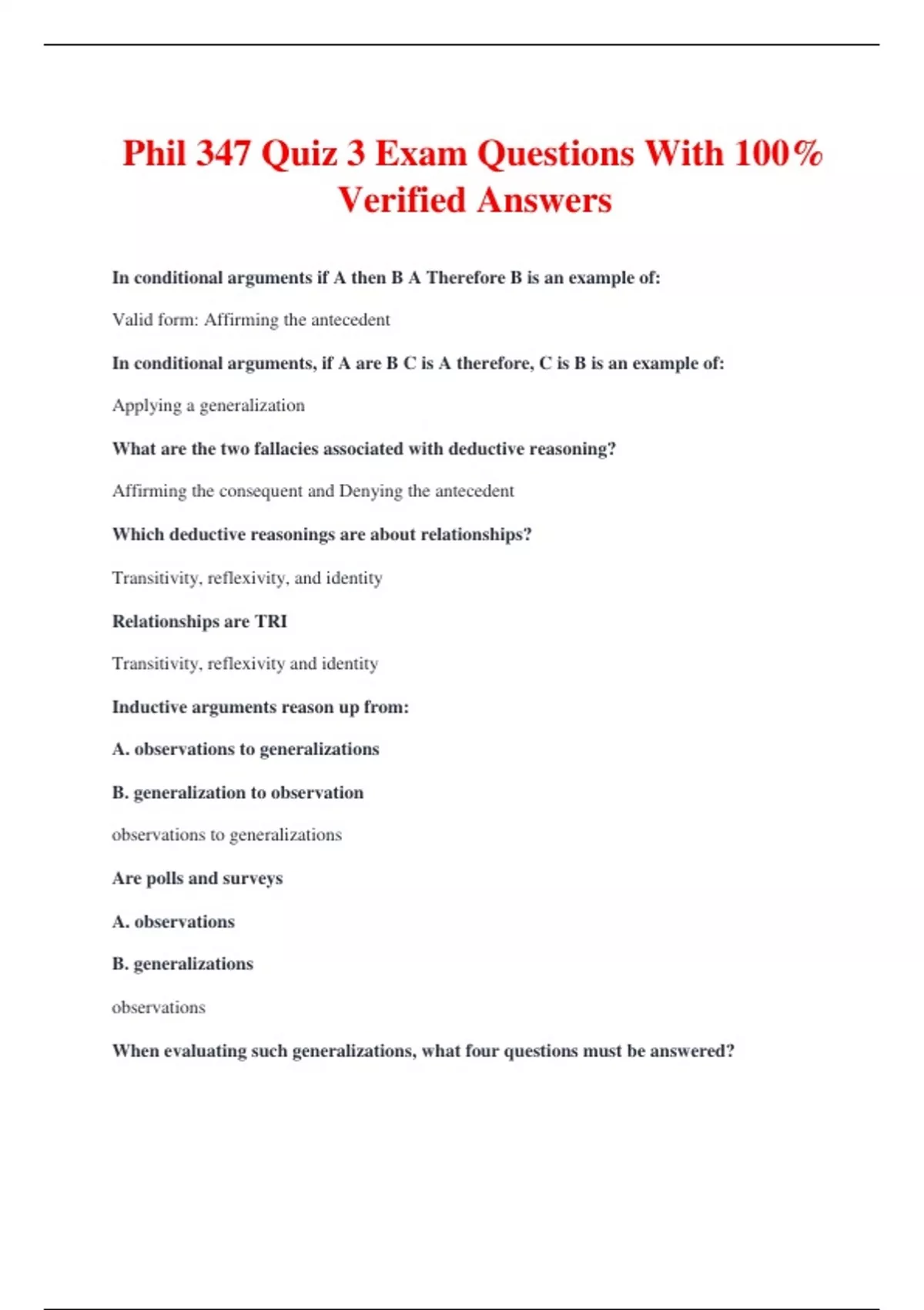 Phil 347 Quiz 3 Exam Questions With 100% Verified Answers In conditional arguments if A then B A Therefore B is an example of: Valid form: Affirming the antecedent In conditional arguments, if A are B C is A therefore, C is B is an example of: Applying a generalization What are the two fallacies associated with deductive reasoning? Affirming the consequent and Denying the antecedent Which deductive reasonings are about relationships? Transitivity, reflexivity, and identity Relationships are TRI Transitivity, reflexivity and identity Inductive arguments reason up from: A. observations to generalizations B. generalization to observation observations to generalizations Are polls and surveys A. observations B. generalizations observations When evaluating such generalizations, what four questions must be answered?