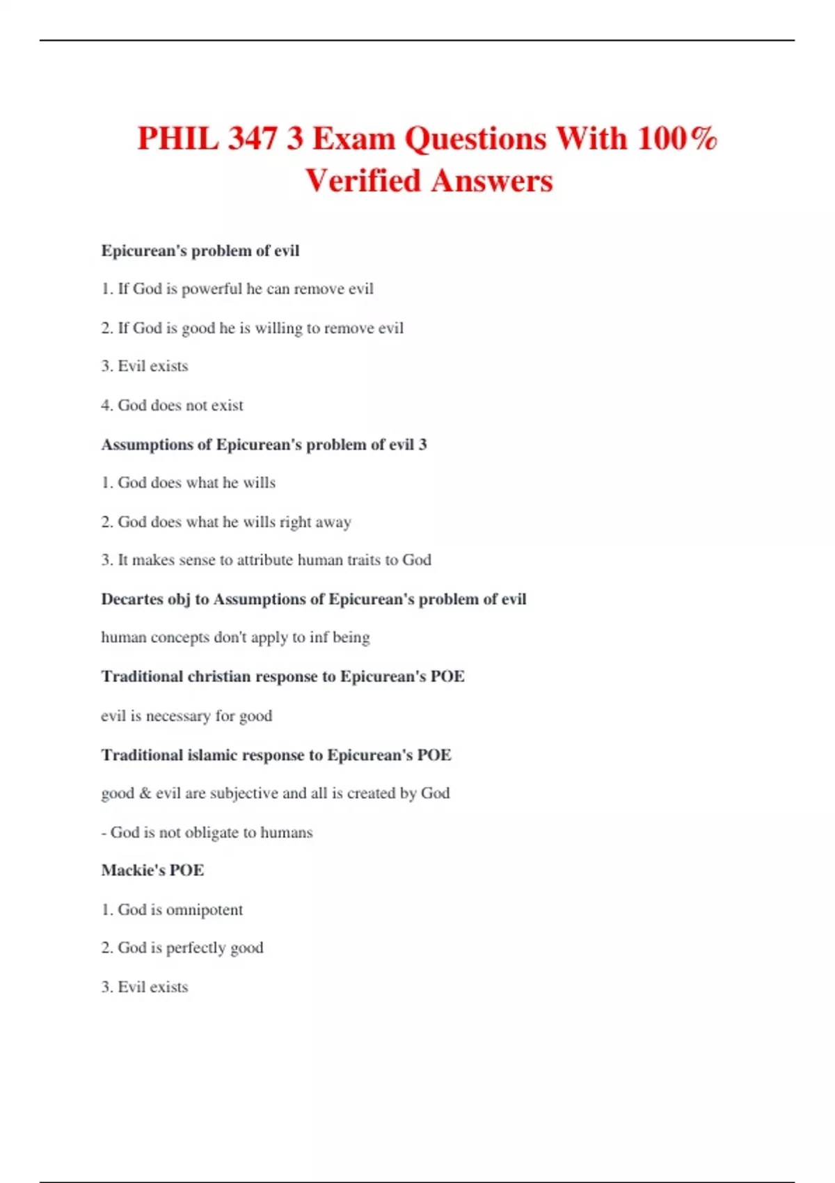 PHIL 347 3 Exam Questions With 100% Verified Answers Epicurean's problem of evil 1. If God is powerful he can remove evil 2. If God is good he is willing to remove evil 3. Evil exists 4. God does not exist Assumptions of Epicurean's problem of evil 3 1. God does what he wills 2. God does what he wills right away 3. It makes sense to attribute human traits to God Decartes obj to Assumptions of Epicurean's problem of evil human concepts don't apply to inf being Traditional christian response to Epicurean's POE evil is necessary for good Traditional islamic response to Epicurean's POE good & evil are subjective and all is created by God - God is not obligate to humans Mackie's POE 1. God is omnipotent 2. God is perfectly good 3. Evil exists