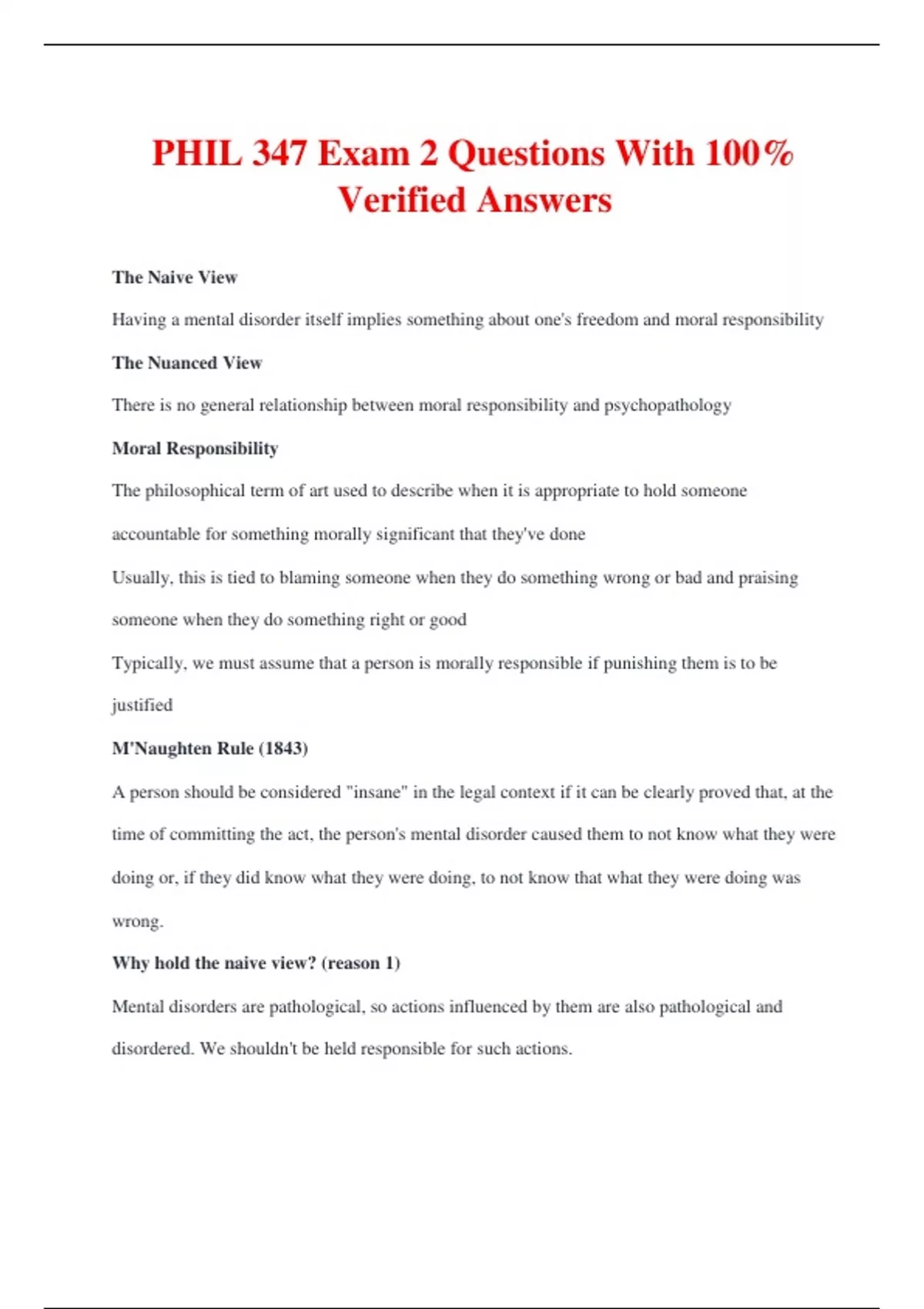 PHIL 347 Exam 2 Questions With 100% Verified Answers The Naive View Having a mental disorder itself implies something about one's freedom and moral responsibility The Nuanced View There is no general relationship between moral responsibility and psychopathology Moral Responsibility The philosophical term of art used to describe when it is appropriate to hold someone accountable for something morally significant that they've done Usually, this is tied to blaming someone when they do something wrong or bad and praising someone when they do something right or good Typically, we must assume that a person is morally responsible if punishing them is to be justified M'Naughten Rule (1843) A person should be considered "insane" in the legal context if it can be clearly proved that, at the time of committing the act, the person's mental disorder caused them to not know what they were doing or, if they did know what they were doing, to not know that what they were doing was wrong. Why hold the naive view? (reason 1) Mental disorders are pathological, so actions influenced by them are also pathological and disordered. We shouldn't be held responsible for such actions. May's response: not all actions resulting from pathological conditions are completely beyond a person's control Why hold the naive view? (reason 2) We cannot be responsible for actions resulting from psychiatric disorders because we are not ultimately responsible for acquiring the disorder in the first place. May's response: this view overgeneralizes to ordinary actions that have nothing to do with mental disorder -- it would result in no one being responsible for anything Why hold the naive view? (reason 3) Mental disorders involve irresistible impulses, delusions, etc., that prevent proper control over one's conduct May's response: this is the strongest reason to favor the naive view. Whether it succeeds hinges on whether all mental disorders genuinely impair a person's agency Implication of the nuanced view We ought to evaluate responsibility on a case-by-case basis, not based on categories of mental disorders Why favor the nuanced view? (reason 1) Symptoms associated with mental disorders can actually increase a persons agency or responsibility Why favor the nuanced view? (reason 2) Although symptoms of mental disorders can diminish agency, they only do in some contexts and do so in varying degrees Numerical Identity