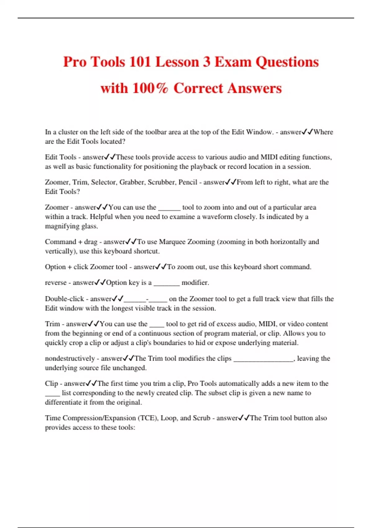 Pro Tools 101 Lesson 3 Exam Questions with 100% Correct Answers In a cluster on the left side of the toolbar area at the top of the Edit Window. - answerWhere are the Edit Tools located? Edit Tools - answerThese tools provide access to various audio and MIDI editing functions, as well as basic functionality for positioning the playback or record location in a session. Zoomer, Trim, Selector, Grabber, Scrubber, Pencil - answerFrom left to right, what are the Edit Tools? Zoomer - answerYou can use the ______ tool to zoom into and out of a particular area within a track. Helpful when you need to examine a waveform closely. Is indicated by a magnifying glass. Command + drag - answerTo use Marquee Zooming (zooming in both horizontally and vertically), use this keyboard shortcut. Option + click Zoomer tool - answerTo zoom out, use this keyboard short command. reverse - answerOption key is a _______ modifier. Double-click - answer______-_____ on the Zoomer tool to get a full track view that fills the Edit window with the longest visible track in the session. Trim - answerYou can use the ____ tool to get rid of excess audio, MIDI, or video content from the beginning or end of a continuous section of program material, or clip. Allows you to quickly crop a clip or adjust a clip's boundaries to hid or expose underlying material. nondestructively - answerThe Trim tool modifies the clips ________________, leaving the underlying source file unchanged. Clip - answerThe first time you trim a clip, Pro Tools automatically adds a new item to the ____ list corresponding to the newly created clip. The subset clip is given a new name to differentiate it from the original. Time Compression/Expansion (TCE), Loop, and Scrub - answerThe Trim tool button also provides access to these tools: