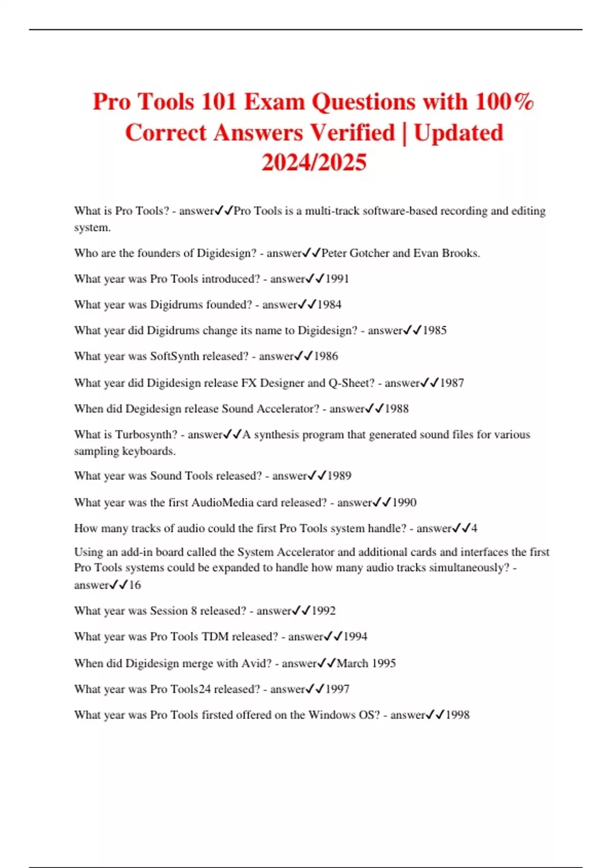 Pro Tools 101 Exam Questions with 100% Correct Answers Verified | Updated 2024/2025 What is Pro Tools? - answerPro Tools is a multi-track software-based recording and editing system. Who are the founders of Digidesign? - answerPeter Gotcher and Evan Brooks. What year was Pro Tools introduced? - answer1991 What year was Digidrums founded? - answer1984 What year did Digidrums change its name to Digidesign? - answer1985 What year was SoftSynth released? - answer1986 What year did Digidesign release FX Designer and Q-Sheet? - answer1987 When did Degidesign release Sound Accelerator? - answer1988 What is Turbosynth? - answerA synthesis program that generated sound files for various sampling keyboards. What year was Sound Tools released? - answer1989 What year was the first AudioMedia card released? - answer1990 How many tracks of audio could the first Pro Tools system handle? - answer4 Using an add-in board called the System Accelerator and additional cards and interfaces the first Pro Tools systems could be expanded to handle how many audio tracks simultaneously? - answer16 What year was Session 8 released? - answer1992 What year was Pro Tools TDM released? - answer1994 When did Digidesign merge with Avid? - answerMarch 1995 What year was Pro Tools24 released? - answer1997 What year was Pro Tools firsted offered on the Windows OS? - answer1998 What year did Digidesign first start offering dedicated control surfaces for Pro Tools? - answer1998 What year was the Control24 introduced? - answer2001 What year did Digidesign receive a Technical GRAMMY Award? - answer2001 What year was Pro ToolsHD introduced? - answer2002 What year was the Mbox introduced? - answer2002 What year was the Digi 002 and Digi 002 Rack introduced? - answer2002 What year did Digidesign receive an Academy Award for the design, development, and implementation of the Digidesign Pro Tools digital audio workstations? - answer2003 What year did Avid acquire M-Audio? - answerAugust 2004 What year was the Pro Tools M-Powered software released? - answer2005 When did Digidesign introduce the ICON and D-Control work surface? - answerICON - 2004 D-Control - 2005 What are the basic parameters of a waveform? - answerA waveform is the sound pressure variations that reach our ears creating our perception of the sounds source. What are the basic parameters of frequency? - answerThe frequency of sound pressure variations that reach our ears creates our perception of pitch. As the vibration increases the pitch of the sound goes up. What are the basic parameters of amplitude? - answerAmplitude is the intensity of the sound pressure variations that reaches our ears creating the perception of loudness of sound. What is the frequency range of human hearing? - answer20Hz - 20kHz What is the difference between analog and digital audio? - answerAnalog is smooth continuous variation in air pressure. Digital is discrete measurements of air pressure. What are the two audio connections on the rear panel of many Pro Tools audio interfaces? - answerS/PDIF - RCA Jacks - Sony/Philips Digital Interface AES/EBU - XLR connectors - Audio Engineering Society/European Broadcast Union What are the maximum sample rates and bit depths that pro Tools LE can handle? - answer96kHz Sample Rate and 24 bits