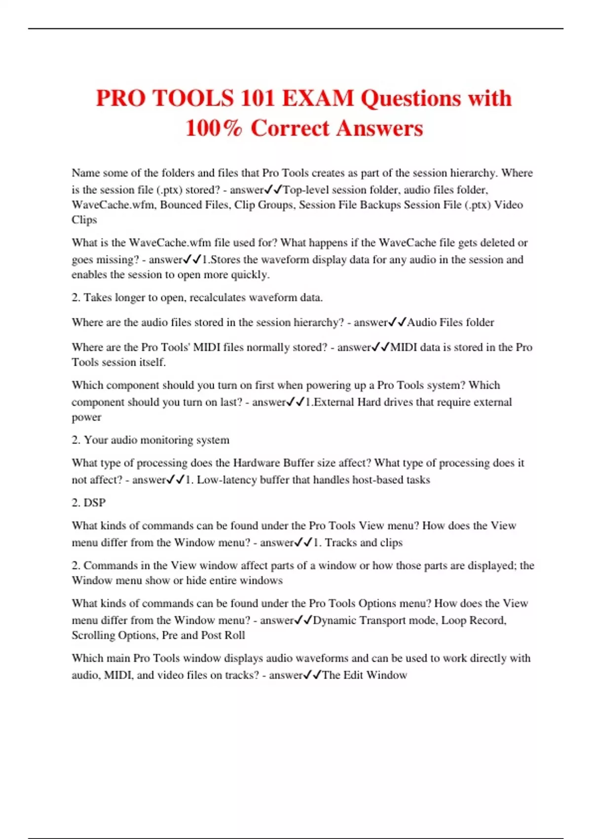 PRO TOOLS 101 EXAM Questions with 100% Correct Answers Name some of the folders and files that Pro Tools creates as part of the session hierarchy. Where is the session file (.ptx) stored? - answerTop-level session folder, audio files folder, WaveC, Bounced Files, Clip Groups, Session File Backups Session File (.ptx) Video Clips What is the WaveC file used for? What happens if the WaveCache file gets deleted or goes missing? - answer1.Stores the waveform display data for any audio in the session and enables the session to open more quickly. 2. Takes longer to open, recalculates waveform data. Where are the audio files stored in the session hierarchy? - answerAudio Files folder Where are the Pro Tools' MIDI files normally stored? - answerMIDI data is stored in the Pro Tools session itself. Which component should you turn on first when powering up a Pro Tools system? Which component should you turn on last? - answer1.External Hard drives that require external power 2. Your audio monitoring system What type of processing does the Hardware Buffer size affect? What type of processing does it not affect? - answer1. Low-latency buffer that handles host-based tasks 2. DSP What kinds of commands can be found under the Pro Tools View menu? How does the View menu differ from the Window menu? - answer1. Tracks and clips 2. Commands in the View window affect parts of a window or how those parts are displayed; the Window menu show or hide entire windows What kinds of commands can be found under the Pro Tools Options menu? How does the View menu differ from the Window menu? - answerDynamic Transport mode, Loop Record, Scrolling Options, Pre and Post Roll Which main Pro Tools window displays audio waveforms and can be used to work directly with audio, MIDI, and video files on tracks? - answerThe Edit Window Which Pro Tools window provides access to Pan controls and Volume Faders for each track? - answerThe Mix Window What icon is used for the Zoomer tool in the Edit window? How can you use this tool to quickly zoom out to fill the Edit window with the longest track in the session? - answer1. Magnifying glass 2. Double-click on the Zoomer tool. Which Edit tool is represented by a hand icon? What is this tool used for? - answer1. Grabber Tool 2. Arranging Clips Which tool is active when the trim, selector, and grabber icons are all selected (highlighted in blue) in the Edit window Toolbar? - answerThe Smart Tool What are the four Edit modes in Pro Tools? How can you switch between them? - answer1. Shuffle, Slip, Grid, Spot 2. Clicking them or Tilde to toggle between them, F1-F4 Why should you use caution when editing synchronized material in Shuffle mode? When is Shuffle Mode useful? - answer1. Causing timing changes for only the track you're editing on. 2. When you're pasting clips in a location and don't want them to overlap onto clips currently in that location. How does editing a clip in Slip mode affect the timing of other clips on the track? - answerAny edits performed will not affect timing of other clips on the track When is it helpful to work in Spot mode? Grid mode? - answer1. Spot when you want to control placement or duration of a clip by precise numerical values. 2. Grid is precise while editing clips in precise time intervals. What are some ways to set the Main Time Scale in Pro Tools? - answer1. View > Main Counter 2. Main Time Scale drop-down menu What are the two types of Rulers available in Pro Tools? What is the difference? - answer1. Time-based Rulers and Conductor Rulers 2. Timebase rulers measure time in various ways: Bars|Beats, Min:Secs, Samples, Timecode, Feet+Frames Conductor Rules contain events that map put locations- markers, tempo, meter, key, chords What are some ways to hide Rulers? - answer1. View > Rulers