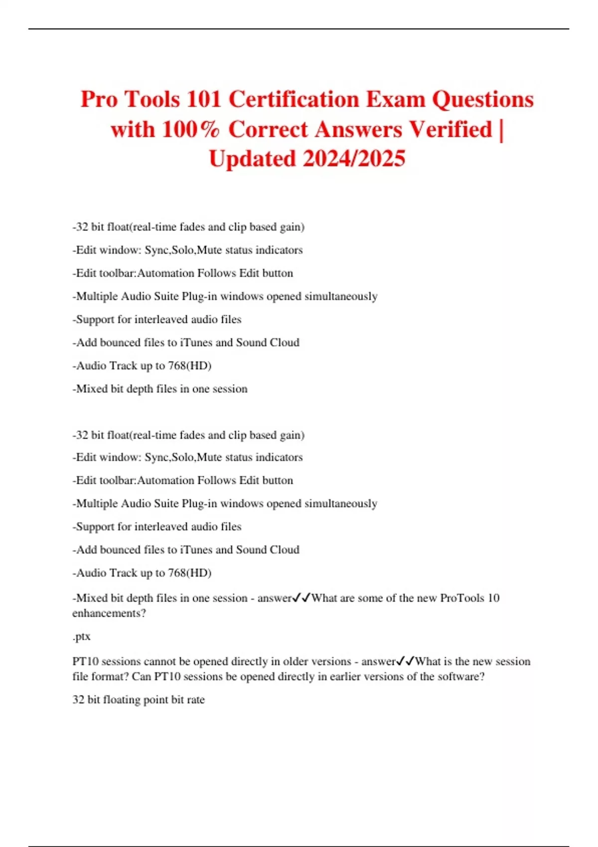 Pro Tools 101 Certification Exam Questions with 100% Correct Answers Verified | Updated 2024/2025 -32 bit float(real-time fades and clip based gain) -Edit window: Sync,Solo,Mute status indicators -Edit toolbar:Automation Follows Edit button -Multiple Audio Suite Plug-in windows opened simultaneously -Support for interleaved audio files -Add bounced files to iTunes and Sound Cloud -Audio Track up to 768(HD) -Mixed bit depth files in one session -32 bit float(real-time fades and clip based gain) -Edit window: Sync,Solo,Mute status indicators -Edit toolbar:Automation Follows Edit button -Multiple Audio Suite Plug-in windows opened simultaneously -Support for interleaved audio files -Add bounced files to iTunes and Sound Cloud -Audio Track up to 768(HD) -Mixed bit depth files in one session - answerWhat are some of the new ProTools 10 enhancements? .ptx PT10 sessions cannot be opened directly in older versions - answerWhat is the new session file format? Can PT10 sessions be opened directly in earlier versions of the software? 32 bit floating point bit rate