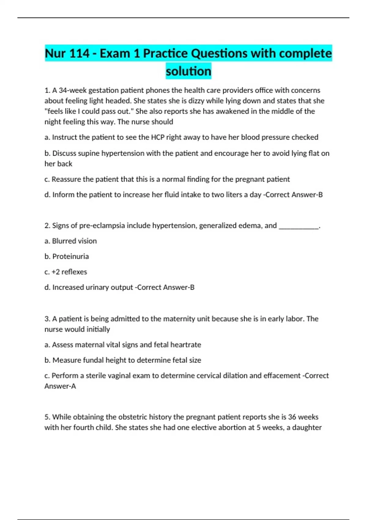 Nur 114 - Exam 1 Practice Questions with complete solution 1. A 34-week gestation patient phones the health care providers office with concerns about feeling light headed. She states she is dizzy while lying down and states that she "feels like I could pass out." She also reports she has awakened in the middle of the night feeling this way. The nurse should a. Instruct the patient to see the HCP right away to have her blood pressure checked b. Discuss supine hypertension with the patient and encourage her to avoid lying flat on her back c. Reassure the patient that this is a normal finding for the pregnant patient d. Inform the patient to increase her fluid intake to two liters a day -Correct Answer-B 2. Signs of pre-eclampsia include hypertension, generalized edema, and __________. a. Blurred vision b. Proteinuria c. +2 reflexes d. Increased urinary output -Correct Answer-B 3. A patient is being admitted to the maternity unit because she is in early labor. The nurse would initially a. Assess maternal vital signs and fetal heartrate b. Measure fundal height to determine fetal size c. Perform a sterile vaginal exam to determine cervical dilation and effacement -Correct Answer-A 5. While obtaining the obstetric history the pregnant patient reports she is 36 weeks with her fourth child. She states she had one elective abortion at 5 weeks, a daughter who was born at 40 weeks gestation, and a son who was born at 37 weeks gestation. What is this patients GTPAL total? a. 4-1-1-1-2 b. 3-1-1-1-2 c. 2-1-0-1-1 d. 4-2-1-0-2 -Correct Answer-A 6. The maternal serum alfa-fetal protein (MSAFP) sample collected from the patient at 16 weeks gestation indicated that this pregnancy is at high-risk for having Down Syndrome. The patient is informed that she will require further diagnostic testing. For these findings, the MSAFP level was a. Decreased b. Increased -Correct Answer-A 8. The
