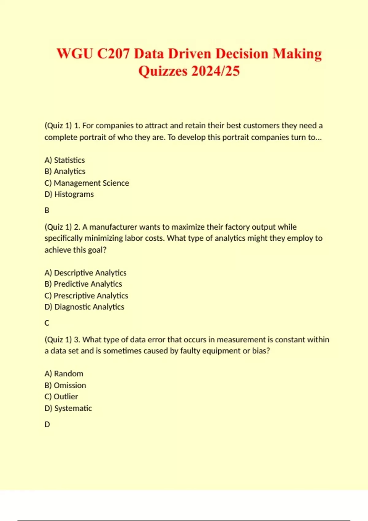WGU C207 Data Driven Decision Making Quizzes 2024/25 (Quiz 1) 1. For companies to attract and retain their best customers they need a complete portrait of who they are. To develop this portrait companies turn to... A) Statistics B) Analytics C) Management Science D) Histograms B