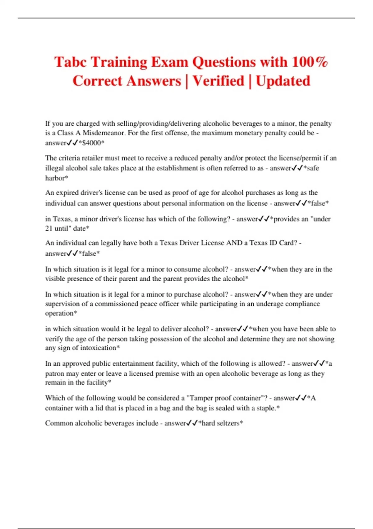 Tabc Training Exam Questions with 100% Correct Answers | Verified | Updated If you are charged with selling/providing/delivering alcoholic beverages to a minor, the penalty is a Class A Misdemeanor. For the first offense, the maximum monetary penalty could be - answer*$4000* The criteria retailer must meet to receive a reduced penalty and/or protect the license/permit if an illegal alcohol sale takes place at the establishment is often referred to as - answer*safe harbor* An expired driver's license can be used as proof of age for alcohol purchases as long as the individual can answer questions about personal information on the license - answer*false* in Texas, a minor driver's license has which of the following? - answer*provides an "under 21 until" date* An individual can legally have both a Texas Driver License AND a Texas ID Card? - answer*false* In which situation is it legal for a minor to consume alcohol? - answer*when they are in the visible presence of their parent and the parent provides the alcohol* In which situation is it legal for a minor to purchase alcohol? - answer*when they are under supervision of a commissioned peace officer while participating in an underage compliance operation* in which situation would it be legal to deliver alcohol? - answer*when you have been able to verify the age of the person taking possession of the alcohol and determine they are not showing any sign of intoxication* In an approved public entertainment facility, which of the following is allowed? - answer*a patron may enter or leave a licensed premise with an open alcoholic beverage as long as they remain in the facility* Which of the following would be considered a "Tamper proof container"? - answer*A container with a lid that is placed in a bag and the bag is sealed with a staple.* Common alcoholic beverages include - answer*hard seltzers*