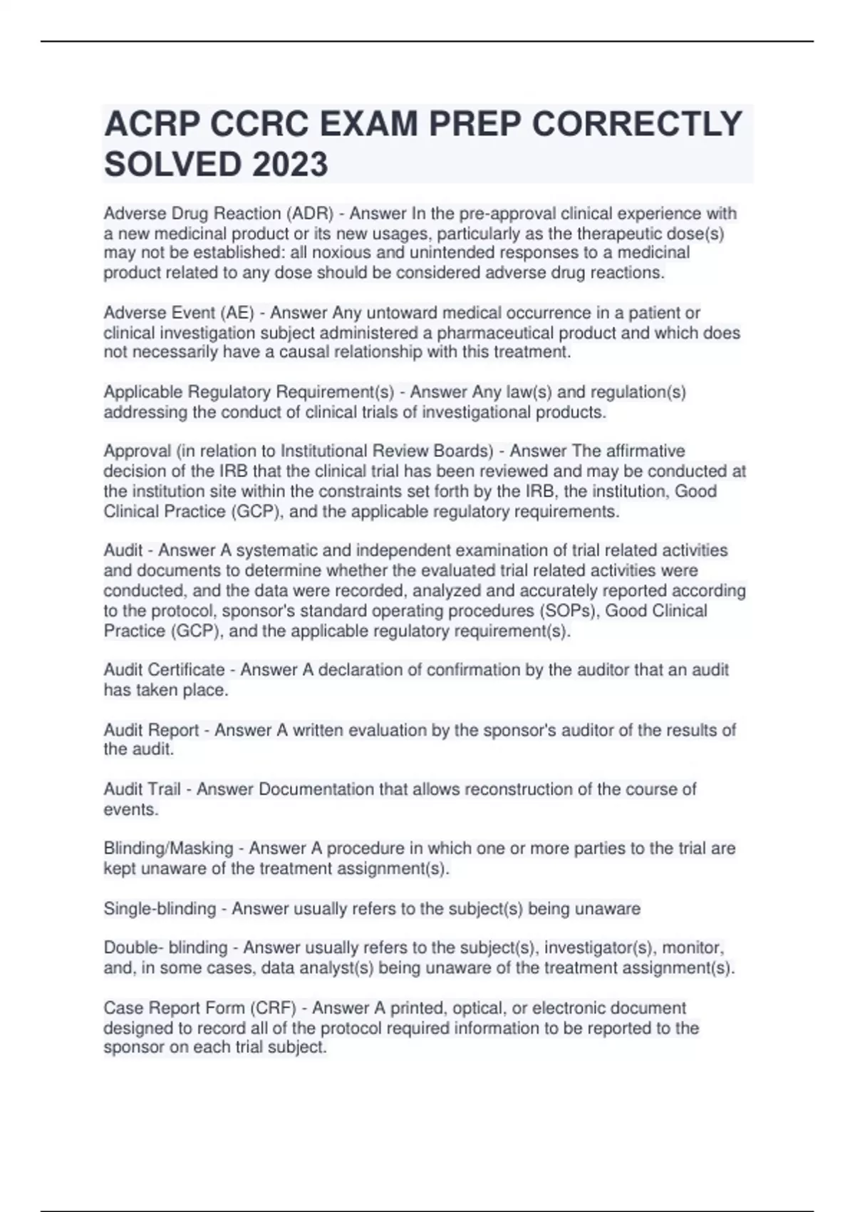 ACRP CCRC EXAM PREP CORRECTLY SOLVED 2023/2024 updated version Adverse Drug Reaction (ADR) - Answer In the pre-approval clinical experience with a new medicinal product or its new usages, particularly as the therapeutic dose(s) may not be established: all noxious and unintended responses to a medicinal product related to any dose should be considered adverse drug reactions. Adverse Event (AE) - Answer Any untoward medical occurrence in a patient or clinical investigation subject administered a pharmaceutical product and which does not necessarily have a causal relationship with this treatment. Applicable Regulatory Requirement(s) - Answer Any law(s) and regulation(s) addressing the conduct of clinical trials of investigational products.