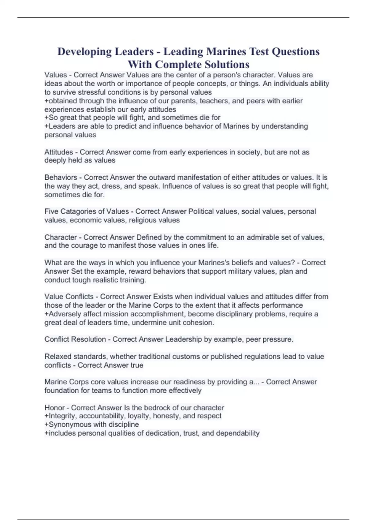 Values - Correct Answer Values are the center of a person's character. Values are ideas about the worth or importance of people concepts, or things. An individuals ability to survive stressful conditions is by personal values +obtained through the influence of our parents, teachers, and peers with earlier experiences establish our early attitudes +So great that people will fight, and sometimes die for +Leaders are able to predict and influence behavior of Marines by understanding personal values Attitudes - Correct Answer come from early experiences in society, but are not as deeply held as values Behaviors - Correct Answer the outward manifestation of either attitudes or values. It is the way they act, dress, and speak. Influence of values is so great that people will fight, sometimes die for. Five Catagories of Values - Correct Answer Political values, social values, personal values, economic values, religious values Character - Correct Answer Defined by the commitment to an admirable set of values, and the courage to manifest those values in ones life. What are the ways in which you influence your Marines's beliefs and values? - Correct Answer Set the example, reward behaviors that support military values, plan and conduct tough realistic training. Value Conflicts - Correct Answer Exists when individual values and attitudes differ from those of the leader or the Marine Corps to the extent that it affects performance +Adversely affect mission accomplishment, become disciplinary problems, require a great deal of leaders time, undermine unit cohesion. Conflict Resolution - Correct Answer Leadership by example, peer pressure. Relaxed standards, whether traditional customs or published regulations lead to value conflicts - Correct Answer true Marine Corps core values increase our readiness by providing a... - Correct Answer foundation for teams to function more effectively Honor - Correct Answer Is the bedrock of our character +Integrity, accountability, loyalty, honesty, and respect +Synonymous with discipline +includes personal qualities of dedication, trust, and dependability Courage - Correct Answer Marine Corps core value that is the heart of our values