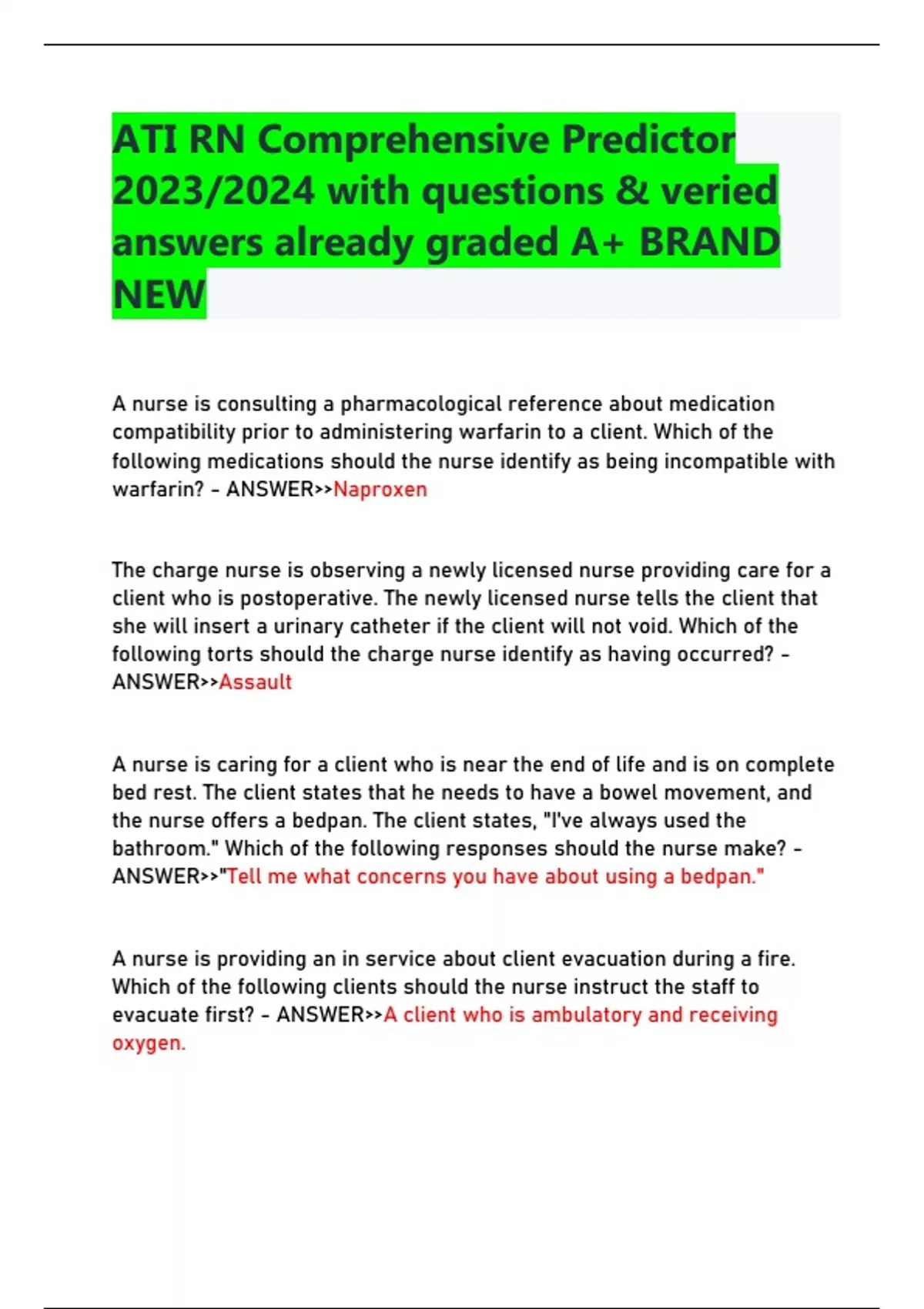 ATI RN Comprehensive Predictor 2023 /2024 with questions & veried answers already graded A+ BRAND NEW A nurse is consulting a pharmacological reference about medication compatibility prior to administering warfarin to a client. Which of the following medications should the nurse identify as being incompatible with warfarin? - ANSWER>>Naproxen The charge nurse is observing a newly licensed nurse providing care for a client who is postoperative. The newly licensed nurse tells the client that she will insert a urinary catheter if the client will not void. Which of the following torts should the charge nurse identify as having occurred? - ANSWER>>Assault A nurse is caring for a client who is near the end of life and is on complete bed rest. The client states that he needs to have a bowel movement, and the nurse offers a bedpan. The client states, "I've always used the bathroom." Which of the following responses should the nurse make? - ANSWER>>"Tell me what concerns you have about using a bedpan." A nurse is providing an in service about client evacuation during a fire. Which of the following clients should the nurse instruct the staff to evacuate first? - ANSWER>>A client who is ambulatory and receiving oxygen. A nurse is assessing a client who has a possible right pneumothorax. Which of the following findings should the nurse expect? - ANSWER>>Reduced right-side breath sounds A nurse is caring for a client who is postoperative following a liver biopsy. In which of the following positions should the nurse place the client immediately following the procedure? - ANSWER>>Right lateral A nurse is caring for a client who states he recently purchased lavender oil to use when he gets the flu. The nurse should recognize which of the following findings as a potential contraindication for using lavender? - ANSWER>>The client has a history of asthma The nurse is providing discharge teaching to a client following a total gastrectomy. The nurse should instruct the client about which of the following medications? - ANSWER>>Vitamin B12 A nurse is teaching a newly licensed nurse about caring for clients in the emergency department. Which of the following actions should the nurse include when teaching about interacting with a client who is aggressive pacing and speaking loudly? - ANSWER>>Tell the client, "you seem to be very upset" A nurse is teaching a client about family planning using the basal body temperature method. Which of the following instructions should the nurse include in the teaching? - ANSWER>>Take your temperature immediately after waking and before getting out of bed