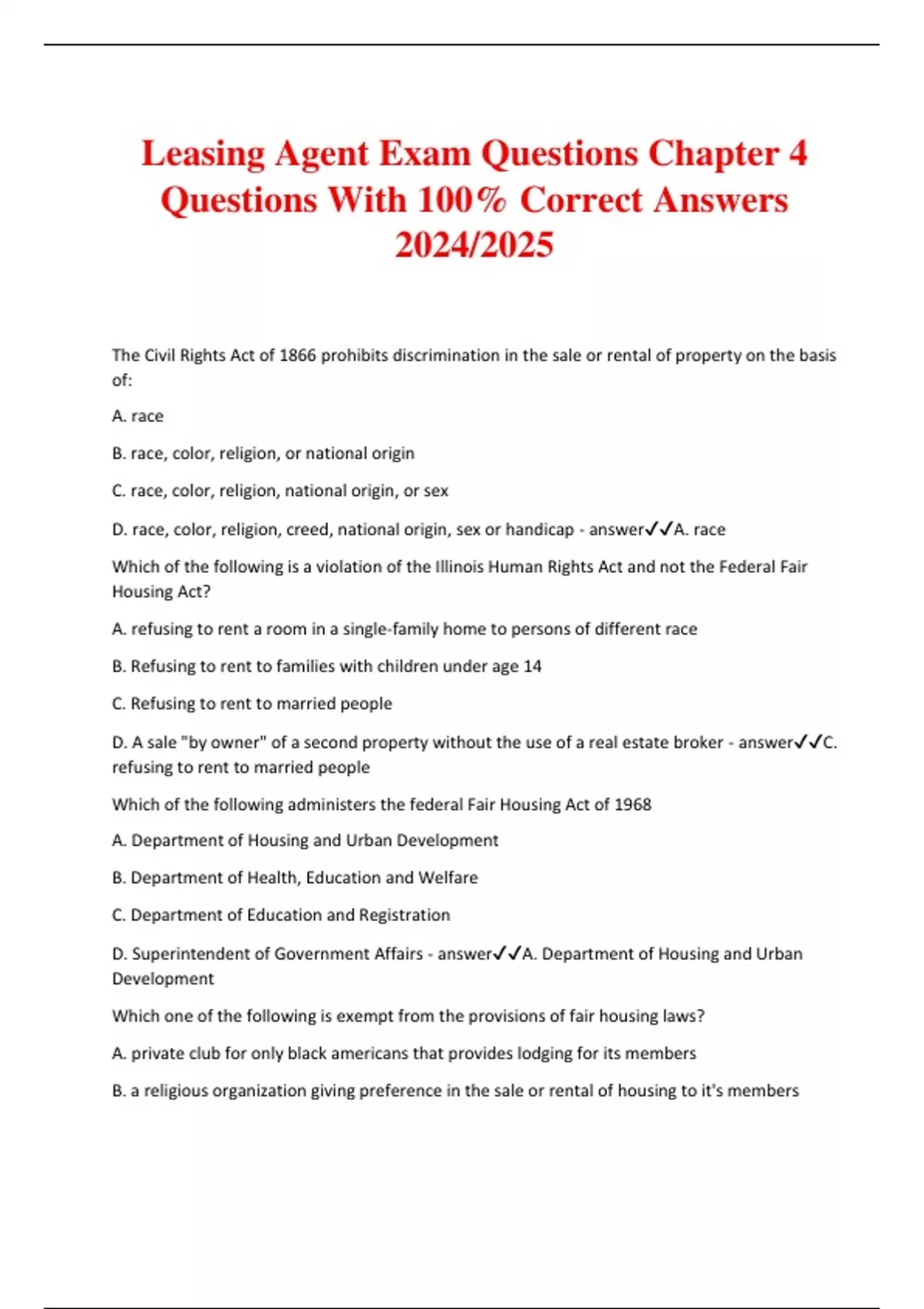 Leasing Agent Exam Questions Chapter 4 Questions With 100% Correct Answers 2024/2025 The Civil Rights Act of 1866 prohibits discrimination in the sale or rental of property on the basis of: A. race B. race, color, religion, or national origin C. race, color, religion, national origin, or sex D. race, color, religion, creed, national origin, sex or handicap - answerA. race Which of the following is a violation of the Illinois Human Rights Act and not the Federal Fair Housing Act? A. refusing to rent a room in a single-family home to persons of different race B. Refusing to rent to families with children under age 14 C. Refusing to rent to married people D. A sale "by owner" of a second property without the use of a real estate broker - answerC. refusing to rent to married people Which of the following administers the federal Fair Housing Act of 1968 A. Department of Housing and Urban Development B. Department of Health, Education and Welfare C. Department of Education and Registration D. Superintendent of Government Affairs - answerA. Department of Housing and Urban Development Which one of the following is exempt from the provisions of fair housing laws? A. private club for only black americans that provides lodging for its members B. a religious organization giving preference in the sale or rental of housing to it's members