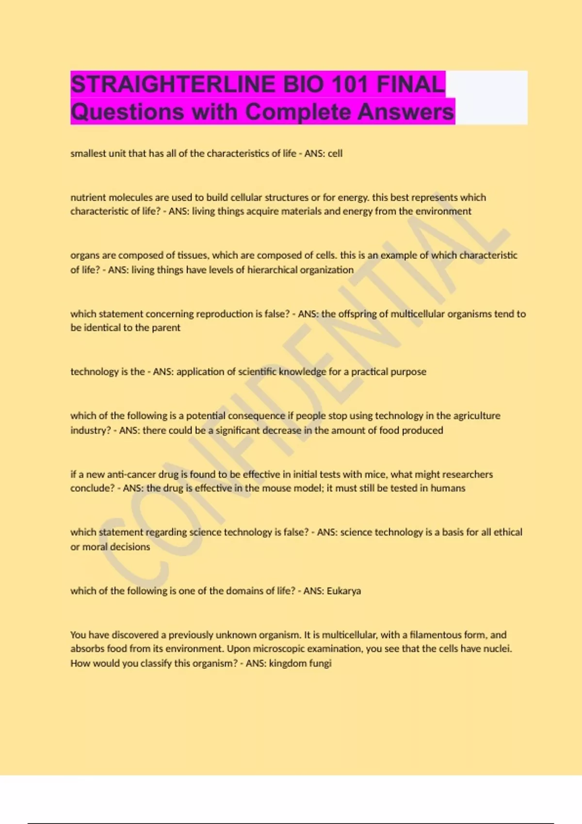 straighterline bio 101 final questions with comple