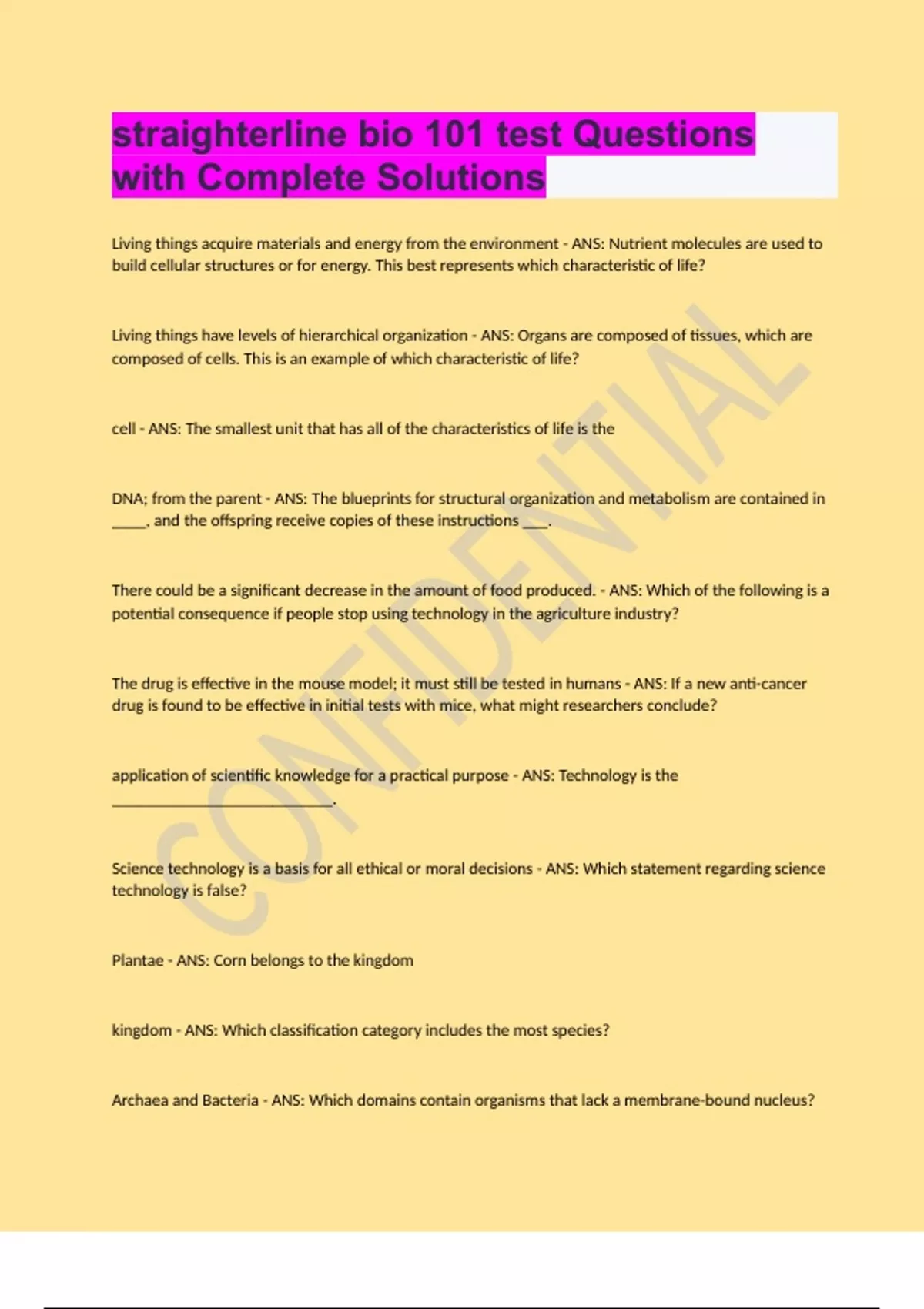 straighterline bio 101 test questions with complet