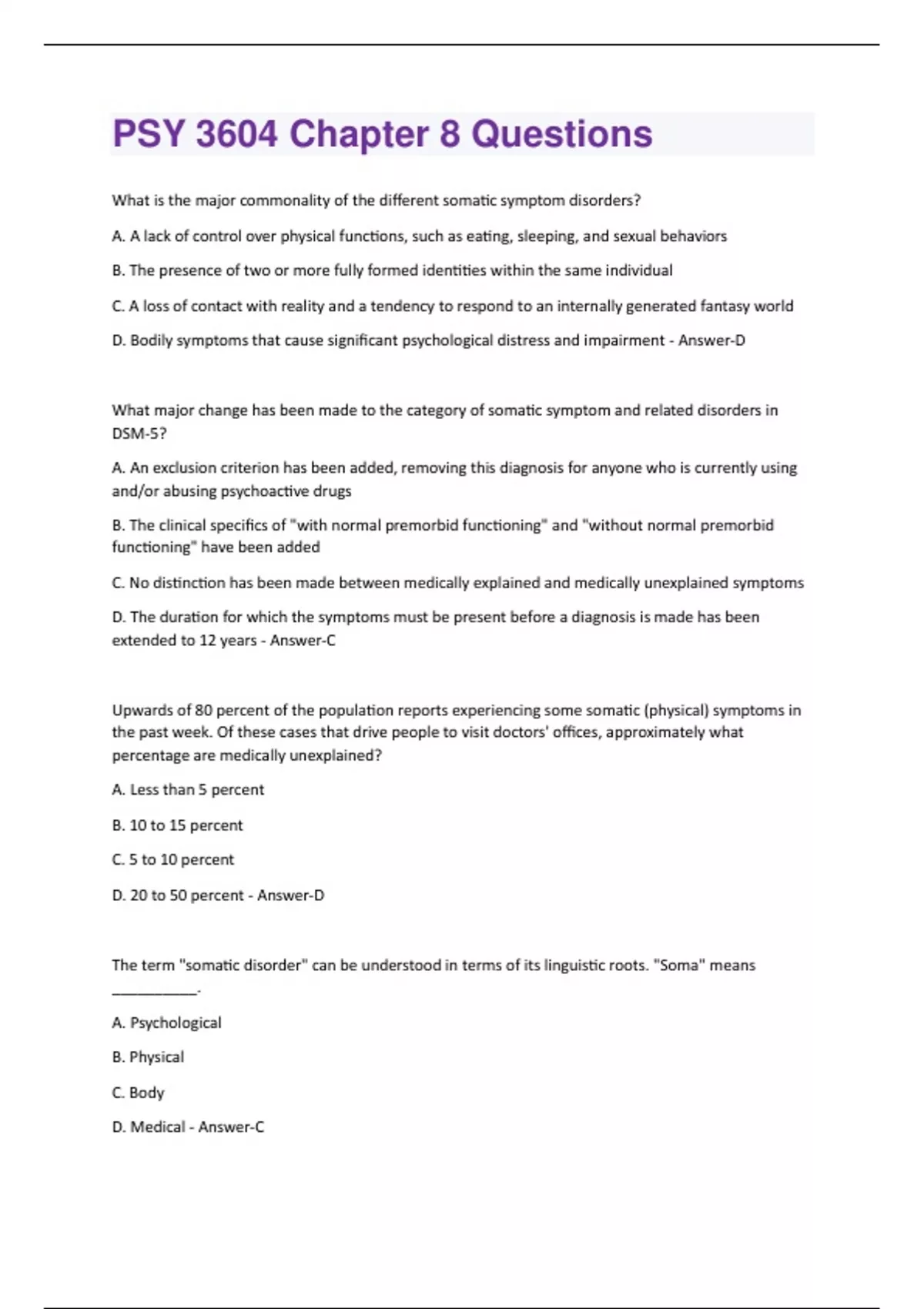 What is the major commonality of the different somatic symptom disorders? A. A lack of control over physical functions, such as eating, sleeping, and sexual behaviors B. The presence of two or more fully formed identities within the same individual C. A loss of contact with reality and a tendency to respond to an internally generated fantasy world D. Bodily symptoms that cause significant psychological distress and impairment - Answer-D What major change has been made to the category of somatic symptom and related disorders in DSM-5? A. An exclusion criterion has been added, removing this diagnosis for anyone who is currently using and/or abusing psychoactive drugs B. The clinical specifics of "with normal premorbid functioning" and "without normal premorbid functioning" have been added C. No distinction has been made between medically explained and medically unexplained symptoms D. The duration for which the symptoms must be present before a diagnosis is made has been extended to 12 years - Answer-C Upwards of 80 percent of the population reports experiencing some somatic (physical) symptoms in the past week. Of these cases that drive people to visit doctors' offices, approximately what percentage are medically unexplained? A. Less than 5 percent B. 10 to 15 percent C. 5 to 10 percent D. 20 to 50 percent - Answer-D The term "somatic disorder" can be understood in terms of its linguistic roots. "Soma" means __________. A. Psychological B. Physical C. Body D. Medical - Answer-CAlan Frances, who served as the chair of the task force that developed DSM-IV, has called the new DSM-5 somatic symptom disorder a __________. A. "Much needed revision that focuses on real psychological symptoms" that should be a useful category for practicing clinicians B. "Cumbersome product that relies too heavily on identifiable physical conditions for diagnosis" C."Significant improvement over the separate, narrowly defined categories used in the DSM-IV" D. "Loosely defined and fatally flawed" diagnosis and recommended that clinicians not use it - Answer-D The historical roots of somatoform disorders date back to __________. A. Medical models that looked at abnormalities in limbic system structures B. The psychoanalytic concept of hysteria and the work of Freud, Breuer, and Janet C. Early classical conditioning theorizing by Watson and the belief that behaviors associated with somatoform disorders were a product of faulty learning D. The humanist perspective championed by Rogers and Maslow which suggests that somatoform disorders develop in response to blocking self-actualization - Answer-B According to cognitive-behavioral formulations, somatic symptom disorder can be viewed as a disorder of both __________. A. Perception and cognition B. Mind and spirit C. Insufficient dopamine availability in the brain and cognitive processes D. Emotional expression and physical state - Answer-A Which of the following personality traits are considered risk factors for developing somatic symptom disorder? A. Extraversion, stoicism, and narcissism B. Conscientiousness, narcissism, and affect lability C. Negative affect, absorption, and alexithymia D. Openness, affect lability, and high fear of death - Answer-C