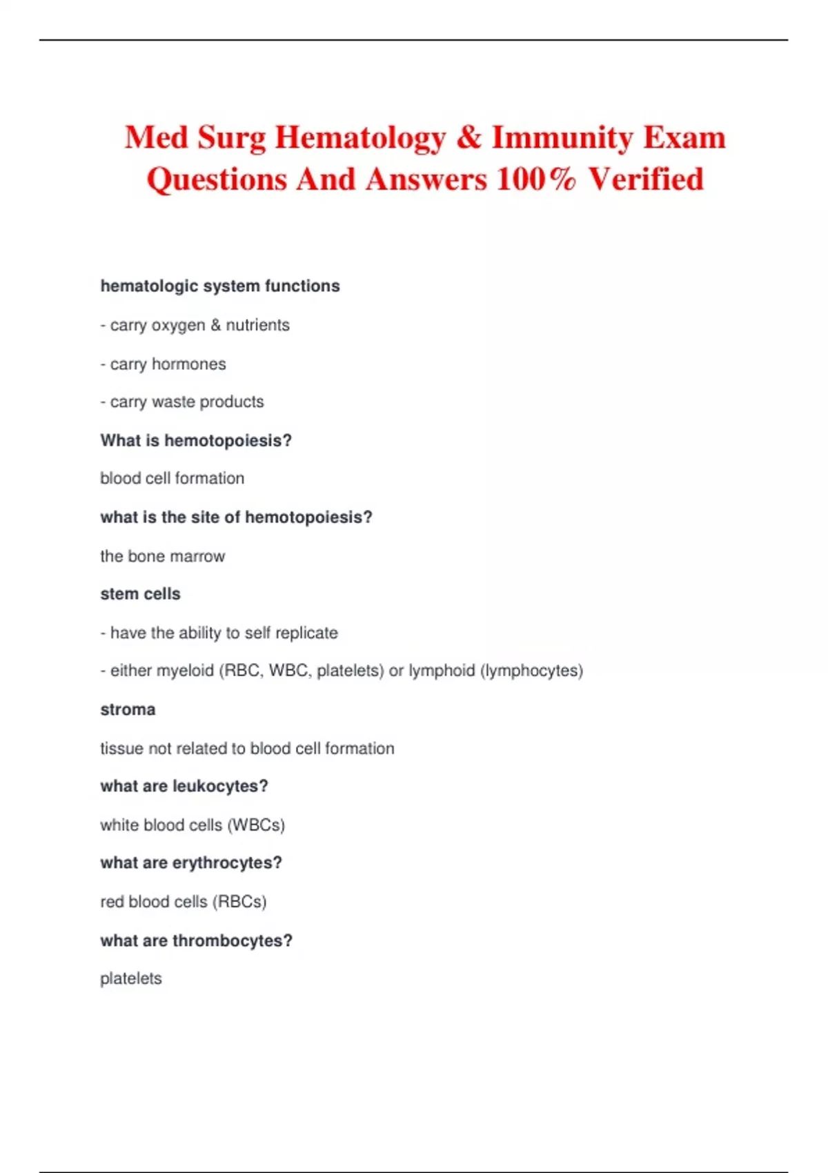 Med Surg Hematology & Immunity Exam Questions And Answers 100% Verified hematologic system functions - carry oxygen & nutrients - carry hormones - carry waste products What is hemotopoiesis? blood cell formation what is the site of hemotopoiesis? the bone marrow stem cells - have the ability to self replicate - either myeloid (RBC, WBC, platelets) or lymphoid (lymphocytes) stroma tissue not related to blood cell formation what are leukocytes? white blood cells (WBCs) what are erythrocytes? red blood cells (RBCs) what are thrombocytes? platelets WBC function fight infection neutrophil function prevents bacterial infection through phagocytosis monocyte function macrophages against fungus eosinophil function neutralizes histamine basophil function helps with hypersensitivity reactions L lymphocyte function recognizes material as "foreign" B lymphocyte function formation of antibodies RBC function carries oxygen thrombocyte function blood clotting types of erythrocytes hemoglobin and reticulocytes (immature form of RBCs) blood transfusion rx - lower back pain - low BP, high rr - flushing * stop transfusion and run NS s/s of anemia - fatigue - palor - tongue changes diagnostic testing for anemia - hemoglobin - hematocrit - reticulocyte count - RBC - iron studies - Vit b 12 - folate - bone marrow aspiration anemia gerontologic considerations - decreased physical performance - decreased mobility - increased depression - increased risk for falls - fatigue - confusion what is iron deficiency anemia