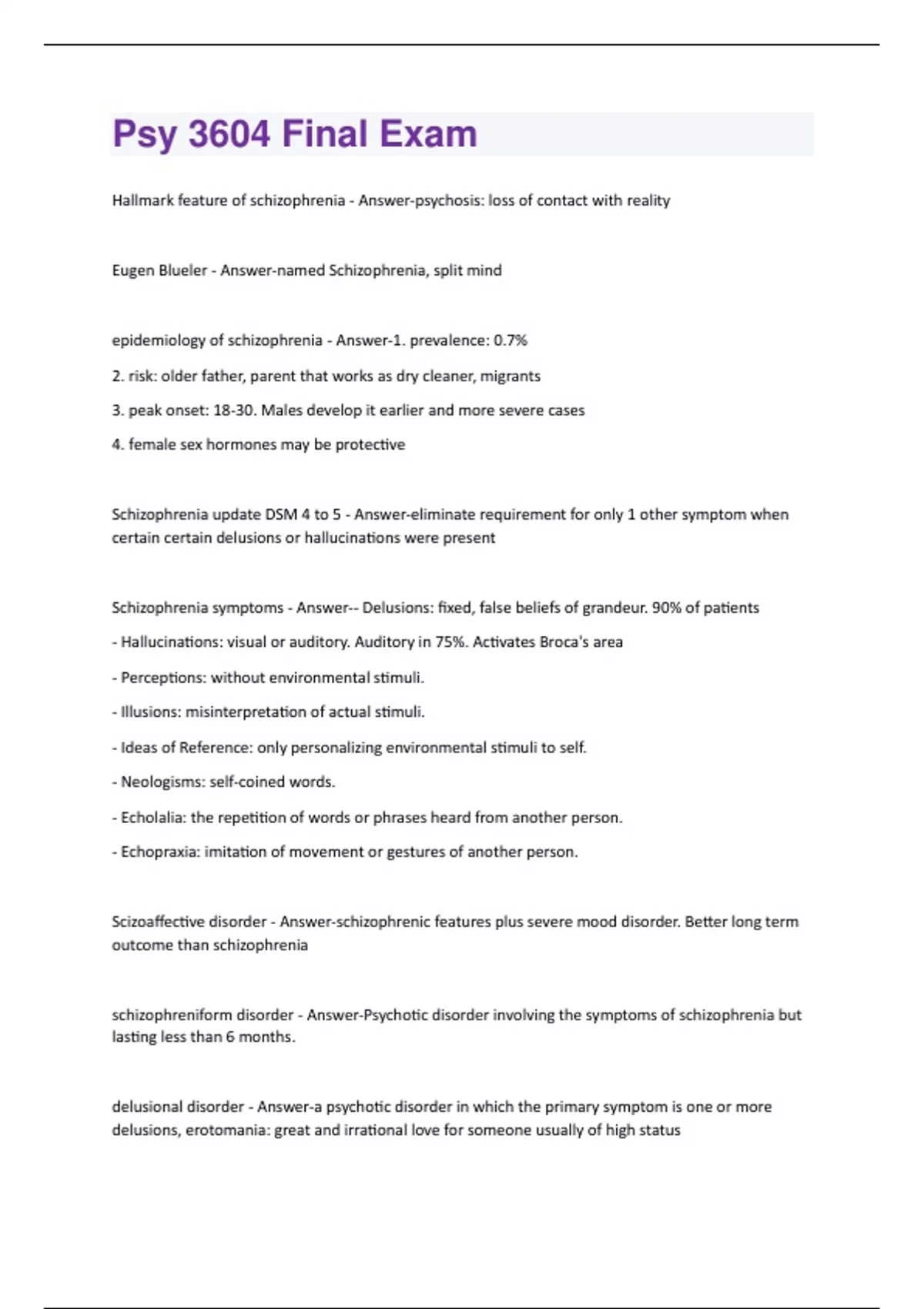 Hallmark feature of schizophrenia - Answer-psychosis: loss of contact with reality Eugen Blueler - Answer-named Schizophrenia, split mind epidemiology of schizophrenia - Answer-1. prevalence: 0.7% 2. risk: older father, parent that works as dry cleaner, migrants 3. peak onset: 18-30. Males develop it earlier and more severe cases 4. female sex hormones may be protective Schizophrenia update DSM 4 to 5 - Answer-eliminate requirement for only 1 other symptom when certain certain delusions or hallucinations were present Schizophrenia symptoms - Answer-- Delusions: fixed, false beliefs of grandeur. 90% of patients - Hallucinations: visual or auditory. Auditory in 75%. Activates Broca's area - Perceptions: without environmental stimuli. - Illusions: misinterpretation of actual stimuli. - Ideas of Reference: only personalizing environmental stimuli to self. - Neologisms: self-coined words. - Echolalia: the repetition of words or phrases heard from another person. - Echopraxia: imitation of movement or gestures of another person. Scizoaffective disorder - Answer-schizophrenic features plus severe mood disorder. Better long term outcome than schizophrenia schizophreniform disorder - Answer-Psychotic disorder involving the symptoms of schizophrenia but lasting less than 6 months. delusional disorder - Answer-a psychotic disorder in which the primary symptom is one or more delusions, erotomania: great and irrational love for someone usually of high statusbrief psychotic disorder - Answer-psychotic episodes with a duration of at least 1 day but less than 1 month, usually caused by stress Family factors in schizophrenia - Answer-1. MZG concordance is 28% 2. Finnish adoptive family study: genetic risk plus family communication deviance leads to thought disorder. Diathesis-stress model. 3. kids of normal MZG twin have same rate of inheritance as schizophrenic twin Molecular genetics of Schizophrenia - Answer-1. candidate genes: suspected to play a role 2. COMT: chromosome 22, dopamine metabolism, people with certain variant more likely to become psychotic if they use cannabis as adolescent 3. neuregulin 1 and dysbindin gene affect dopamine receptors 4. endophenotypes: perceptual aberrations, magical ideation, poor performance on working memory tests 5. copy number variations imply link with ASD and ADHD prenatal exposures and schizophrenia - Answer-1. Virus: maternal influenza during pregnancy triggers proinflammatory cytokines and raises risk 3-7x 2. patients with schizophrenia have 53% chance of having immune disorder 3. rhesus incompatibility raises risk to 2% 4. famine 2x risk. 5. maternal stress 67% risk increase 6. MZ monochorionic embryos (share placenta) have 60% concordance. Dichrionic have 11% neurodevelopmental exposures of Schizophrenia - Answer-1. preschizophrenia: children show motor abnormalities. Found in home videos 2. attenuated psychosis syndrome: mild psychotic symptoms at risk for further schizophrenia. Needs more research, could lead to stigma Neurocognition in Schizophrenia - Answer-1. Low IQ increases risk 2. decline in cognitive ability and IQ in predromal phase 3. poor reaction time, poor continuous performance test, poor memory, less prefrontal cortex activity, poor smooth pursuit eye movement 4. no auditory habituation. P50 suppression isn't presentBrain volume and function and schizophrenia - Answer-1. enlarged ventricles 2. 3% reduction of brain volume 3. prefrontal, temporal, amygdala, hippocampus, thalamus affected 4. disconnectivity in white matter 5. cytoarchitecture changes: increased or decreased density 6. excessive pruning 7. head injuries increase risk Neurochemistry of Schizophrenia - Answer-1. excess dopamine 2. antipyschotics block dopamine receptors 3. abuse of amphetamines increases dopamine and can cause psychosis 4. "aberrant salience" model proposes that psychotic symptoms first emerge when chaotic brain dopamine transmission leads to the attribution of significance to stimuli that would normally be considered irrelevant. 5. low glutamate levels, which can cause degeneration 6. dopamine inhibits release of glutamate so high DA means low Glut Psychosocial and cultural factors of schizophrenia - Answer-1. schizophrenogenic mothers, cold and aloof, no evidence 2. double-bind hypothesis: mixed parenting signals 3. communication deviance affects genetically at risk 4. expressed emotion (EE): excessive criticism and emotional overinvolvement is predictor of relapse 5. urban living increases risk 6. immigration 7. cannabis: schizophrenic patients 2x more likely to use, which makes symptoms worse Clinical outcome of schizophrenia - Answer-1. 38% favorable outcome 2. 12% need long term institutionalization 3. 30% continued illness 4. increased death by suicide by 12% and is lower in treated patientspharmacology of schizophrenia - Answer-1. first gen: chlorpromazine, haldol, thorazine dopamine antagonists. Can cause Parkinson's like tremors, tardive kinesia in 56% of long term users, 2. neuroleptic malignant syndrome: caused by first gen, toxic reaction, fatal if untreated 3. second gen: clozapine, have less extrapyramidal side effects, drowsiness, weight gain, diabetes 4. estrogen has antipyschotic effect psychosocial approaches to treat schizophrenia - Answer-1. case management increases stability and lowers time in hospitals 2. family therapy lowers EE. Not used as much as it should be 3. social skills training lowers risk of relapse, increases function 4. cognitive remediation 5. exercise: promotes neurogenesis, reduces inflammation, works against weight gain Anosognosia - Answer-A condition in which a person with an illness seems unaware of the existence of his or her illness. Sign of brain damage Diffuse vs. Focal Damage - Answer-1. diffuse: widespread, attention often impaired 2. focal: specific areas of abnormal structural change 3. left brain: language and math 4. right brain: spatial relations, grasping ideas, intution brain injury in accidents - Answer-1