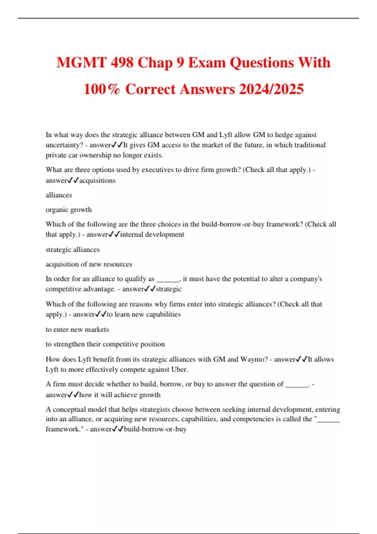 MGMT 498 Chap 9 Exam Questions With 100% Correct Answers 2024/2025 In what way does the strategic alliance between GM and Lyft allow GM to hedge against uncertainty? - answerIt gives GM access to the market of the future, in which traditional private car ownership no longer exists. What are three options used by executives to drive firm growth? (Check all that apply.) - answeracquisitions alliances organic growth Which of the following are the three choices in the build-borrow-or-buy framework? (Check all that apply.) - answerinternal development strategic alliances acquisition of new resources In order for an alliance to qualify as ______, it must have the potential to alter a company's competitive advantage. - answerstrategic Which of the following are reasons why firms enter into strategic alliances? (Check all that apply.) - answerto learn new capabilities to enter new markets to strengthen their competitive position How does Lyft benefit from its strategic alliances with GM and Waymo? - answerIt allows Lyft to more effectively compete against Uber. A firm must decide whether to build, borrow, or buy to answer the question of ______. - answerhow it will achieve growth A conceptual model that helps strategists choose between seeking internal development, entering into an alliance, or acquiring new resources, capabilities, and competencies is called the "______ framework." - answerbuild-borrow-or-buy