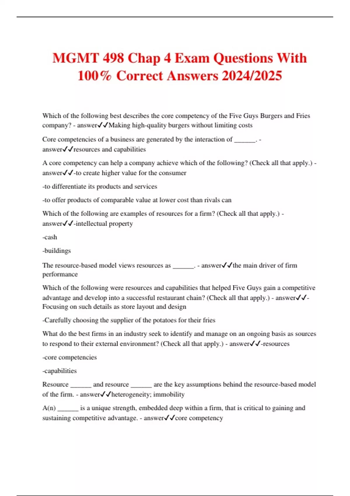 MGMT 498 Chap 4 Exam Questions With 100% Correct Answers 2024/2025 Which of the following best describes the core competency of the Five Guys Burgers and Fries company? - answerMaking high-quality burgers without limiting costs Core competencies of a business are generated by the interaction of ______. - answerresources and capabilities A core competency can help a company achieve which of the following? (Check all that apply.) - answer-to create higher value for the consumer -to differentiate its products and services -to offer products of comparable value at lower cost than rivals can Which of the following are examples of resources for a firm? (Check all that apply.) - answer-intellectual property -cash -buildings The resource-based model views resources as ______. - answerthe main driver of firm performance Which of the following were resources and capabilities that helped Five Guys gain a competitive advantage and develop into a successful restaurant chain? (Check all that apply.) - answer- Focusing on such details as store layout and design -Carefully choosing the supplier of the potatoes for their fries What do the best firms in an industry seek to identify and manage on an ongoing basis as sources to respond to their external environment? (Check all that apply.) - answer-resources -core competencies -capabilities Resource ______ and resource ______ are the key assumptions behind the resource-based model of the firm. - answerheterogeneity; immobility A(n) ______ is a unique strength, embedded deep within a firm, that is critical to gaining and sustaining competitive advantage. - answercore competency