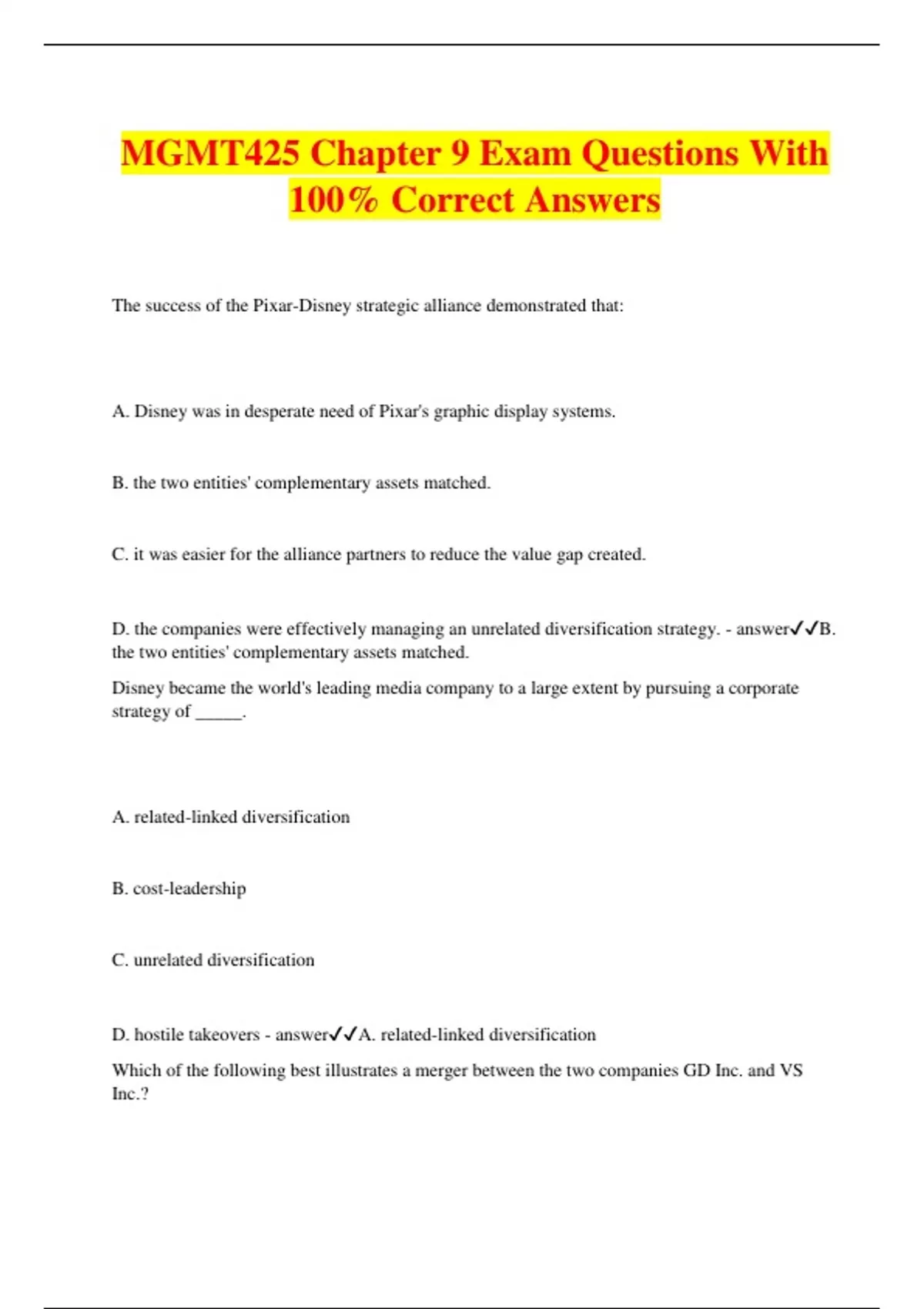 MGMT425 Chapter 9 Exam Questions With 100% Correct Answers The success of the Pixar-Disney strategic alliance demonstrated that: A. Disney was in desperate need of Pixar's graphic display systems. B. the two entities' complementary assets matched. C. it was easier for the alliance partners to reduce the value gap created. D. the companies were effectively managing an unrelated diversification strategy. - answerB. the two entities' complementary assets matched. Disney became the world's leading media company to a large extent by pursuing a corporate strategy of _____. A. related-linked diversification B. cost-leadership C. unrelated diversification D. hostile takeovers - answerA. related-linked diversification Which of the following best illustrates a merger between the two companies GD Inc. and VS Inc.? A. GD Inc. purchases VS Inc. for $80 billion despite VS Inc. being against the purchase. B. GD Inc. and VS Inc. join together to form a third new entity, while they also operate separately. C. GD Inc. outsources a few of its business activities to VS Inc. for competitive advantage. D. GD Inc. and VS Inc. join together to form a single new company called GDVS Inc. - answerD. GD Inc. and VS Inc. join together to form a single new company called GDVS Inc. When does a merger between companies typically occur? A. When two firms of comparable size join to form a combined entity B. When large, incumbent firms buy startup companies C. When a target firm does not want to be acquired D. When two or more firms enter a temporary vertical strategic alliance - answerA. When two firms of comparable size join to form a combined entity The Mansion Hotel Group purchased Red Brick Hotels for an estimated value of $120 billion. All the hotels previously owned by Red Brick Hotels are now managed by the Mansion Hotel Group and are known as Mansion hotels. What does this scenario best illustrate? A. A merger B. A joint venture C. An acquisition D. An equity alliance - answerC. An acquisition Which of the following is true of acquisitions? A. Acquisitions can be friendly or hostile. B. Acquisitions can occur only when the involved entities are of comparable size. C. In acquisitions, two independent companies join to form a separate third entity. D. Acquisitions increase the competitive intensity in an industry. - answerA. Acquisitions can be friendly or hostile. When large, incumbent firms buy startup companies, the transaction is generally described as a(n) _____. A. joint venture B. partnership C. acquisition D. alliance - answerC. acquisition Titan Autos Inc. merged with its competitor, Cadvia Autos Inc. This allowed Titan Autos to use its technological competencies along with Cadvia Autos's marketing capabilities to capture a larger market share than what the two entities individually held. What does this scenario best illustrate? A. Backward integration B. Forward integration C. Horizontal integration D. Vertical integration - answerC. Horizontal integration Which of the following scenarios best illustrates horizontal integration? A. Regal Autos Inc. enters into a licensing contract with a distributor in a new international market. B. Regal Autos Inc. acquires a component parts manufacturer who previously supplied to Regal Autos' competitor. C. Regal Autos Inc. sets up its own distribution channel and retail stores. D. Regal Autos Inc. joins with Marcus Motors Inc., one of its direct competitors. - answerD. Regal Autos Inc. joins with Marcus Motors Inc., one of its direct competitors. How does horizontal integration within an industry affect the surviving firms? A. By increasing the threat the surviving firms will face from new entrants B. By strengthening the rivalry among existing firms C. By requiring the surviving firms to shift their focus from non-price to price competition D. By strengthening the bargaining power of the surviving firms vis-à-vis suppliers and buyers - answerD. By strengthening the bargaining power of the surviving firms vis-à-vis suppliers and buyers Which of the following is a result