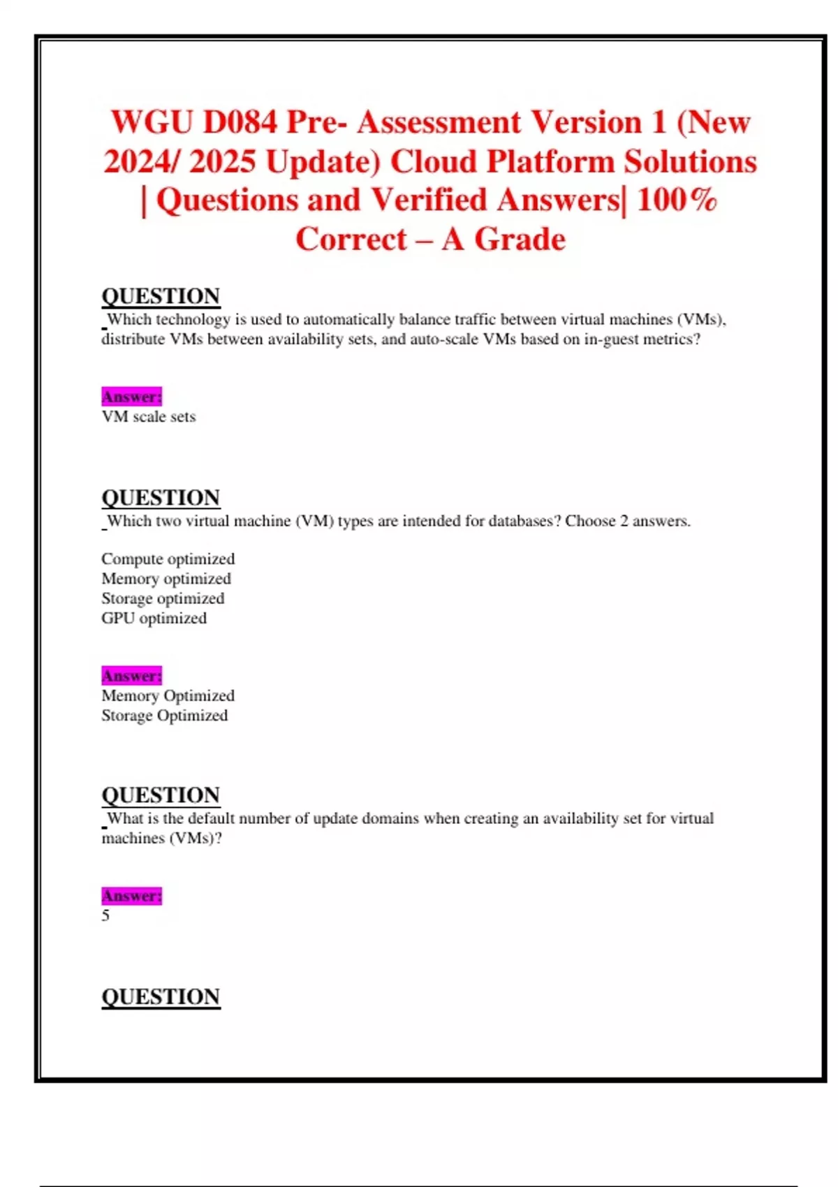 WGU D084 Pre- Assessment Version 1 (New 2024/ 2025 Update) Cloud Platform Solutions | Questions and Verified Answers| 100% Correct – A Grade QUESTION Which technology is used to automatically balance traffic between virtual machines (VMs), distribute VMs between availability sets, and auto-scale VMs based on in-guest metrics? Answer: VM scale sets QUESTION Which two virtual machine (VM) types are intended for databases? Choose 2 answers. Compute optimized Memory optimized Storage optimized GPU optimized Answer: Memory Optimized Storage Optimized QUESTION What is the default number of update domains when creating an availability set for virtual machines (VMs)? Answer: 5 QUESTION Which element of an Azure Resource Manager (ARM) template defines values used as JavaScript Object Notation (JSON) fragments to simplify template language expressions? Answer: Variables QUESTION Which PowerShell cmdlet is used to pass TemplateParameterObject parameter values that are defined directly in a script as .json? Answer: New-AzResourceGroupDeployment QUESTION What does Azure Resource Manager (ARM) incremental mode do? Answer: It changes existing resources in the resource group if they are specified in the template and the settings are different. QUESTION Which feature does an Azure Virtual Machine (VM) scale set provide? Answer: Creates a group of identical load-balanced VMs QUESTION Which schema URL is used when deploying a virtual machine (VM) using an Azure Resource Manager (ARM) template targeted at a resource group? Answer: QUESTION Which Azure service is portable between resource groups without being recreated? Answer: Azure Logic Apps QUESTION Which hardware ratio is used by the general purpose virtual machine (VM) type size? Answer: Balanced CPU to memory QUESTION Which source type is used to create an empty managed disk for Azure Virtu