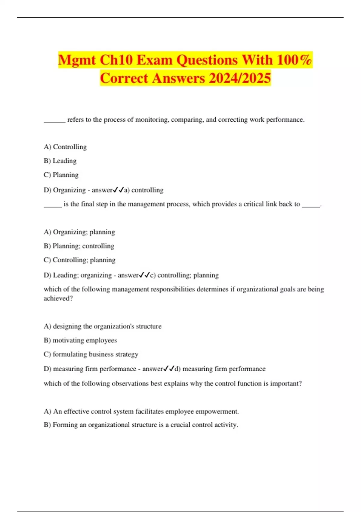 Mgmt Ch10 Exam Questions With 100% Correct Answers 2024/2025 ______ refers to the process of monitoring, comparing, and correcting work performance. A) Controlling B) Leading C) Planning D) Organizing - answera) controlling _____ is the final step in the management process, which provides a critical link back to _____. A) Organizing; planning B) Planning; controlling C) Controlling; planning D) Leading; organizing - answerc) controlling; planning which of the following management responsibilities determines if organizational goals are being achieved? A) designing the organization's structure B) motivating employees C) formulating business strategy D) measuring firm performance - answerd) measuring firm performance which of the following observations best explains why the control function is important? A) An effective control system facilitates employee empowerment. B) Forming an organizational structure is a crucial control activity. C) Human resource management is a subset of the controlling process. D) Organizational strategies are formed during the controlling stage. - answera) an effective control system facilitates employee empowerment the control process assumes that ____. A) employees require clear directions from management B) employees are under-qualified and require training C) performance standards are already in place D) employee monitoring costs are part and parcel of doing business - answerc) performance standards are already in place the first step in the control process is _____. A) setting the desired standards B) measuring actual performance C) comparing performance against expectations D) enforcing managerial control - answerb) measuring actual performance which of the following sources of information for measuring performance has the disadvantage of being subject to personal biases, and is time consuming and obtrusive? A) oral reports B) personal observations C) statistical reports D) written reports - answerb) personal observations which of the following is one of the main advantages of using statistical reports as the source of information? A) Statistical reports can be used to obtain firsthand knowledge. B) Unfiltered information can be obtained using statistical reports. C) Statistical reports are effective for showing relationships.