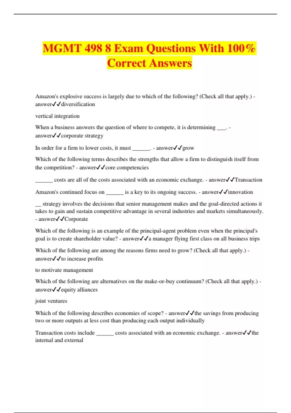 MGMT 498 8 Exam Questions With 100% Correct Answers